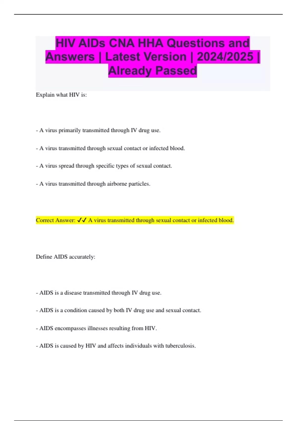 HIV AIDs CNA HHA Questions and Answers | Latest Version | 2024/2025 | Already Passed