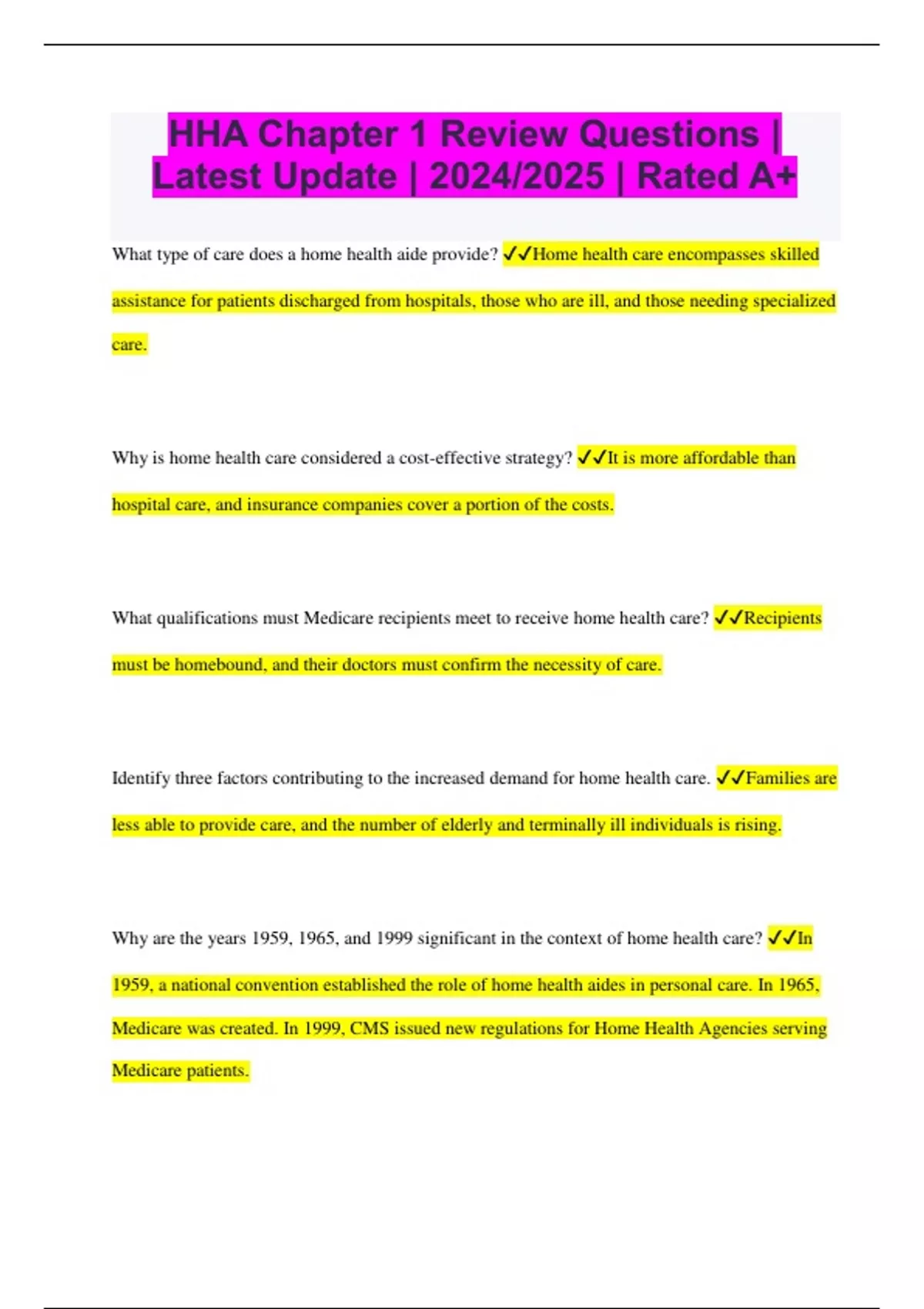 HHA Chapter 1 Review Questions | Latest Update | 2024/2025 | Rated A+ What type of care does a home health aide provide? Home health care encompasses skilled assistance for patients discharged from hospitals, those who are ill, and those needing specialized care. Why is home health care considered a cost-effective strategy? It is more affordable than hospital care, and insurance companies cover a portion of the costs. What qualifications must Medicare recipients meet to receive home health care? Recipients must be homebound, and their doctors must confirm the necessity of care. Identify three factors contributing to the increased demand for home health care. Families are less able to provide care, and the number of elderly and terminally ill individuals is rising. Why are the years 1959, 1965, and 1999 significant in the context of home health care? In 1959, a national convention established the role of home health aides in personal care. In 1965, Medicare was created. In 1999, CMS issued new regulations for Home Health Agencies serving Medicare patients. What is the primary source of payment for home health services? Payment comes from insurance, government programs like Medicare and Medicaid, and individual clients. List ten common services provided by a typical home health agency. 1. Physical, occupational, and speech therapy 2. Medical-surgical nursing care 3. Intravenous infusion therapy 4. Maternal, pediatric, and newborn nursing care 5. Nutritional therapy and dietary counseling 6. Medical social work 7. Personal care 8. Homemaker services 9. Medical equipment rental services 10. Pharmacy services What is a significant difference between working as a home health aide and working in a facility? Housekeeping is crucial due to cultural differences in maintaining a home and dietary preferences. An aide must be