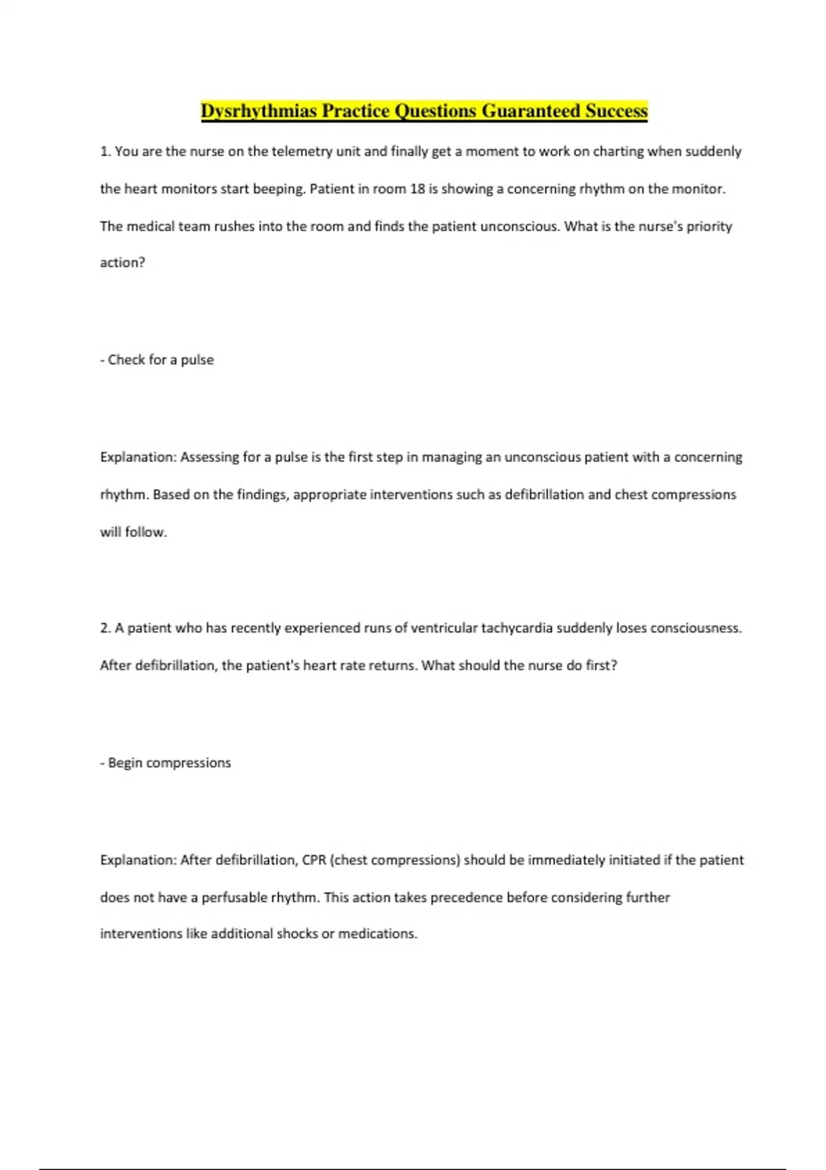 Dysrhythmias Practice Questions Guaranteed Success 1. You are the nurse on the telemetry unit and finally get a moment to work on charting when suddenly the heart monitors start beeping. Patient in room 18 is showing a concerning rhythm on the monitor. The medical team rushes into the room and finds the patient unconscious. What is the nurse's priority action? - Check for a pulse Explanation: Assessing for a pulse is the first step in managing an unconscious patient with a concerning rhythm. Based on the findings, appropriate interventions such as defibrillation and chest compressions will follow. 2. A patient who has recently experienced runs of ventricular tachycardia suddenly loses consciousness. After defibrillation, the patient's heart rate returns. What should the nurse do first? - Begin compressions Explanation: After defibrillation, CPR (chest compressions) should be immediately initiated if the patient does not have a perfusable rhythm. This action takes precedence before considering further interventions like additional shocks or medications. 3. A patient with a history of hypertension and diabetes displays a specific rhythm strip. The patient's vital signs include BP 145/89, HR 90, SpO2 95%, RR 19. What action does the nurse anticipate at this time? - Begin administering anticoagulants Explanation: Given the patient's rhythm and clinical condition, anticoagulation therapy would be appropriate to manage potential risks associated with the rhythm and underlying conditions. These answers summarize the prioritized actions and appropriate responses based on the presented scenarios in a telemetry unit setting. Atrial flutter places the client at high risk for development of clot formation in the atria. Because the client is stable at this time, cardioversion or adenosine would not be performed at this time. Before cardioversion can occur in a patient, anticoagulant therapy should be begun at least 48 hours beforehand if possible. The nurse is preparing to administer adenosine to the patient with the following rhythm which is symptomatic. What should the nurse plan on having in the patient room? Select All That Apply: a) Physician b) Crash cart c) IV pump d) EKG monitor e) Lidocaine ️Answer: A, B, and D Adenosine is administered as a very quick IV push. The physician must be present in the room and the crash cart must be on hand. An ekg monitor should be in the room to monitor the effectiveness of the medication. The nurse has just administered adenosine via IV push and sees the following rhythm on the monitor. What is the nurse's priority intervention? a) Apply conductive gel and defibrillate the patient b) Document the findings and continue to monitor c) Administer another mg of the medication d) Begin chest compressions ️Answer: B This finding would be expected upon administration of adenosine. The rhythm should then begin again in some other rhythm, hopefully normal sinus rhythm. It would be important to document the exact time of this change and continue to monitor the change back to NSR. If this change does not occur, or if another rhythm is produced, appropriate action would then be taken based on th