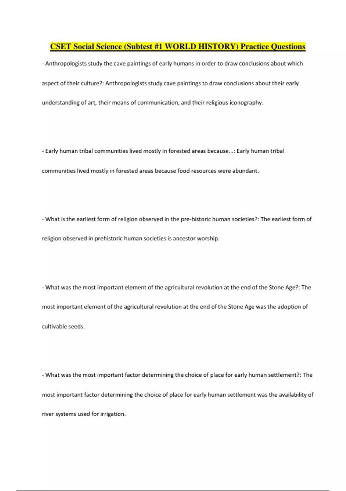 CSET Social Science (Subtest #1 WORLD HISTORY) Practice Questions - Anthropologists study the cave paintings of early humans in order to draw conclusions about which aspect of their culture?: Anthropologists study cave paintings to draw conclusions about their early understanding of art, their means of communication, and their religious iconography. - Early human tribal communities lived mostly in forested areas because...: Early human tribal communities lived mostly in forested areas because food resources were abundant. - What is the earliest form of religion observed in the pre-historic human societies?: The earliest form of religion observed in prehistoric human societies is ancestor worship. - What was the most important element of the agricultural revolution at the end of the Stone Age?: The most important element of the agricultural revolution at the end of the Stone Age was the adoption of cultivable seeds. - What was the most important factor determining the choice of place for early human settlement?: The most important factor determining the choice of place for early human settlement was the availability of river systems used for irrigation. - The major political institution of the Olmec culture was...: The major political institution of the Olmec culture was autonomous chiefdoms. - According to Confucianism, a Superior Man is one who...: According to Confucianism, a Superior Man is one who respects his elders, reveres the past, and adheres to the five cardinal relationships. It integrated each of its satraps into the imperial bureaucracy in order to ensure long term production & payment of tribute ️Why was the Persian Empire the first "world empire"? Male citizens ️Who was qualified to run for an office in ancient Athenian democracy? Control of the trade and commerce in the Mediterranean ️What was the outcome of the Punic Wars for Rome? Compassion & charity to the poor & unfortunate is a religious responsibility Montheistic belief in one God who is all-powerful Despite persecution, both remained faithful to their religion ️In what ways are Judaism & Christianity similar? Proving political merit ️In Confucianism, the major qualification for serving in a public office is... Invasions by various barbarian peoples Lack of tax revenue led to weakened military & deterioration of transportation & trade routes Power struggles over succession ️What were the causes of the fall of the Roman Empire? By the election of his friend Abu Bakr as the Caliph ️How was the political crisis following the de