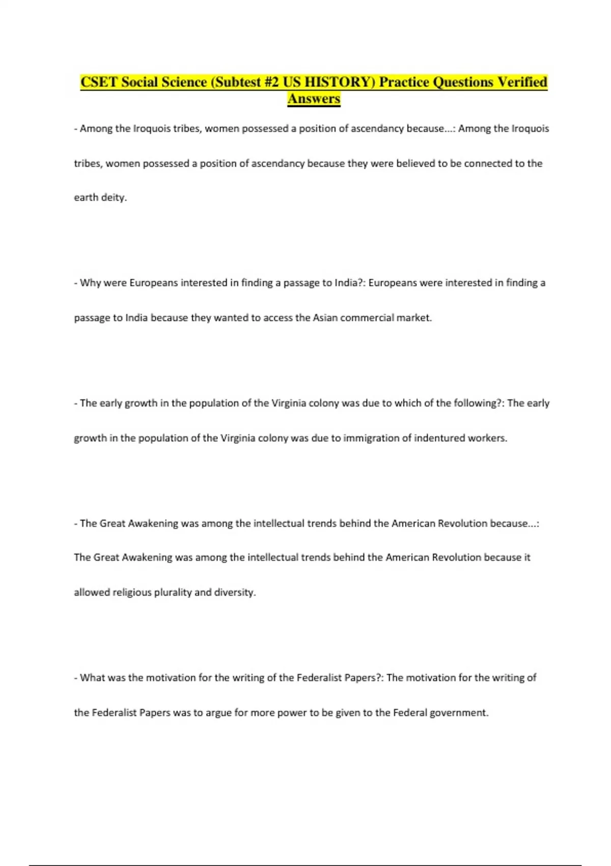 CSET Social Science (Subtest #2 US HISTORY) Practice Questions Verified Answers - Among the Iroquois tribes, women possessed a position of ascendancy because...: Among the Iroquois tribes, women possessed a position of ascendancy because they were believed to be connected to the earth deity. - Why were Europeans interested in finding a passage to India?: Europeans were interested in finding a passage to India because they wanted to access the Asian commercial market. - The early growth in the population of the Virginia colony was due to which of the following?: The early growth in the population of the Virginia colony was due to immigration of indentured workers. - The Great Awakening was among the intellectual trends behind the American Revolution because...: The Great Awakening was among the intellectual trends behind the American Revolution because it allowed religious plurality and diversity. - What was the motivation for the writing of the Federalist Papers?: The motivation for the writing of the Federalist Papers was to argue for more power to be given to the Federal government. - In 1796, the Democratic-Republicans represented which segment of the colonial population?: In 1796, the Democratic-Republicans represented southern tobacco farmers. They declared the Act illegal ️How did Virginia and Kentucky respond to the Sedition Act? Jeffersonian expansionism ️Which of the following was the primary motivation for the Western expansion of the U.S.? The cost of shipping agricultural goods was lowered ️In what way did the railroad most help the American economy in the 19th century? The right of the federal government to interfere with state laws ️What was the legal debate that prompted the secession of the states from the Union prior to the Civil War? Battle of Fort Sumter ️What was the decisive battle that started the Civil War? Prohibited the public expression of legal concern Prohibited testifying against whites Restricted voting rights ️In what way did the Black Codes limit African-American equality? Ratifying the 14th Amendment ️What were the conditions under which the Confederate States were admitted back into the Union? New manufacturing industries ️What was the major market for the products of the mining boom of the late 19th century? The miner's demands were met by the owners with the help of the president ️What was the outc