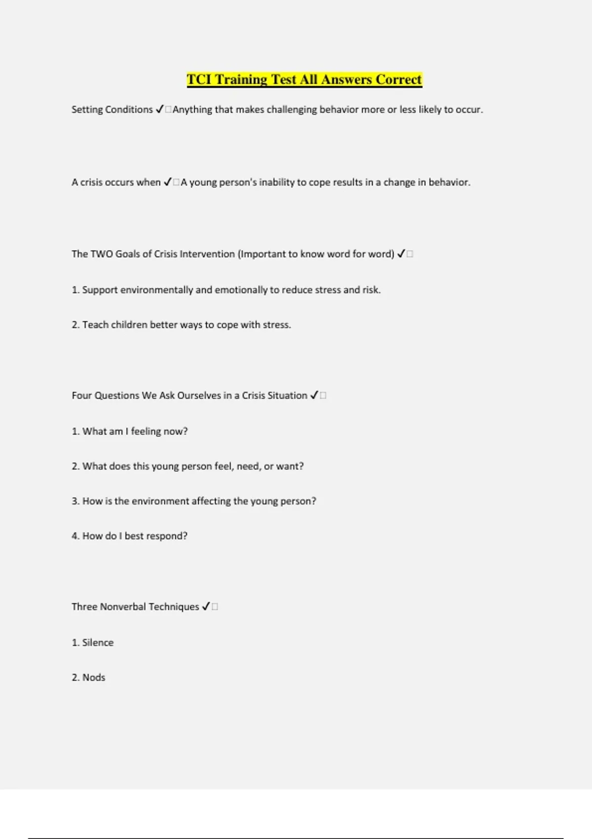 TCI Training Test All Answers Correct Setting Conditions ️Anything that makes challenging behavior more or less likely to occur. A crisis occurs when ️A young person's inability to cope results in a change in behavior. The TWO Goals of Crisis Intervention (Important to know word for word) ️ 1. Support environmentally and emotionally to reduce stress and risk. 2. Teach children better ways to cope with stress. Four Questions We Ask Ourselves in a Crisis Situation ️ 1. What am I feeling now? 2. What does this young person feel, need, or want? 3. How is the environment affecting the young person? 4. How do I best respond? Three Nonverbal Techniques ️ 1. Silence 2. Nods 3. Eye contact Definition of Co-Regulation ️Providing immediate help and support to reduce emotional intensity. Four Strategies for Emotional First Aid (know loosely) ️ 1. Drain off emotions 2. Clarify events 3. Maintain the relationship and lines of communication 4. Remind the child of expectations and mediate the situation if necessary Stress Model of Crisis ️ 1. Triggering event 2. Escalation phase 3. Outburst (crisis) 4. Recovery Four Elements of a Potentially Violent Situation ️ 1. A potential trigger to violence 2. A target 3. A weapon 4. Level of stress or motivation Objective of Crisis Co-Regulation ️To provide support in a way that reduces stress and risk. 7 Steps of the LSI (I ESCAPE) ️1) Isolate convo 2) Explore kid's POV 3) Summarize the feelings and content 4) Connect feelings to behavior 5) Alternative behaviors discussed 6) Plan developed/Practice new behavior 7) Enter young person back into routine The goal of physical intervention ️To ensure safety Physical restraint should only be used when (3) ️1) Agency policies and state regulations approve restraint 2) The YP's ICMP indicates it 3) Our professional risk assessment indicates it Do NOT use physical restraint when (3) ️1) Sexual stimulation is the motivation 2) YP has a weapon 3) YP's medical conditions prohibits it 5 warning signs of asphyxia ️1) YP goes limp and ceases to breathe 2) YP says they can't breathe 3) Respiration is labored 4) May make grunting noises 5) YP vomits or turns a dusky purple color, esp. of the face