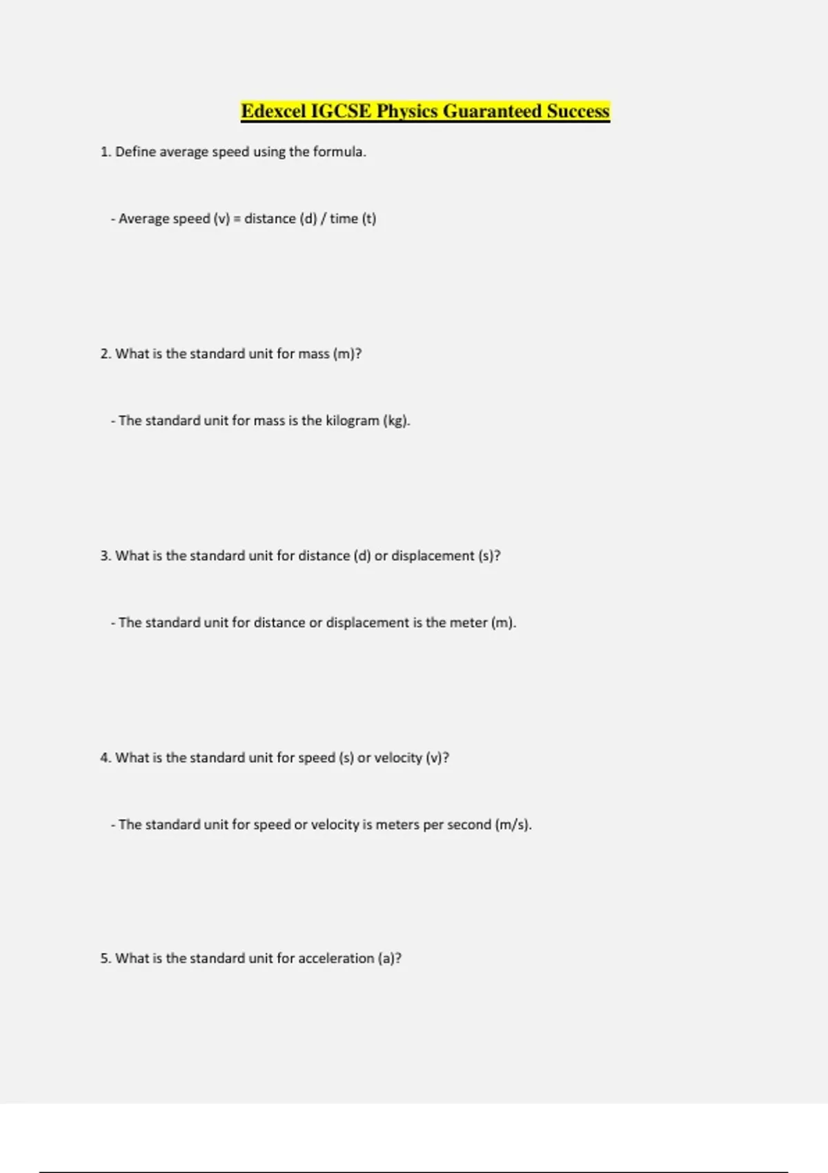 Edexcel IGCSE Physics Guaranteed Success 1. Define average speed using the formula. - Average speed (v) = distance (d) / time (t) 2. What is the standard unit for mass (m)? - The standard unit for mass is the kilogram (kg). 3. What is the standard unit for distance (d) or displacement (s)? - The standard unit for distance or displacement is the meter (m). 4. What is the standard unit for speed (s) or velocity (v)? - The standard unit for speed or velocity is meters per second (m/s). 5. What is the standard unit for acceleration (a)? - The standard unit for acceleration is meters per second squared (m/s²). 6. What is the standard unit for force (F)? - The standard unit for force is the Newton (N). 7. What is the standard unit for time (t)? - The standard unit for time is the second (s). 8. What is the standard unit for gravitational field strength (g)? - The standard unit for gravitational field strength is Newton per kilogram (N/kg). 9. What is the standard unit for moment? - The standard unit for moment, as specified for Paper 2, is the Newton meter (Nm). 10. What is the standard unit for momentum (p)? - The standard unit for momentum, as specified for Paper 2, is kilogram meter per second (kg m/s). What does the gradient of a distance-time graph represent? ️Gradient or the slope gives the speed. Flat line means stationary, straight line means constant speed, curved line means accelerating Describe how to investigate the motion of a toy car ️- Set a ramp up so that the top of it is a certain height, h, above the desk, and the other end is fixed in place on the desk. - Measure the distance the toy car will travel down the ramp using a metre ruler. - Measure the time taken for the toy car to roll down the ramp using a stop watch. - As it is difficult to start and stop the watch at exactly the right time, the experiment is repeated five times so an average time can be calculated. - Divide the distance by the average time to calculate the average speed of the car. - To improve the accuracy of the experiment, light gates connected to electronic timers could be used as human reaction times will no longer affect the results. We still take multiple readings