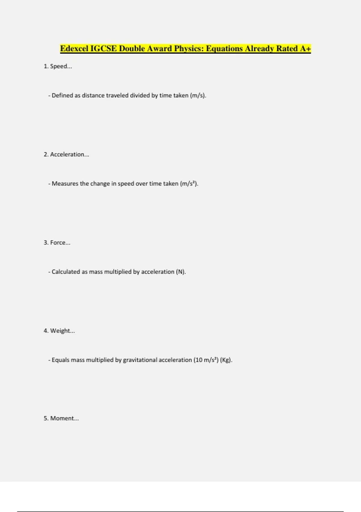 Edexcel IGCSE Double Award Physics: Equations Already Rated A+ 1. Speed... - Defined as distance traveled divided by time taken (m/s). 2. Acceleration... - Measures the change in speed over time taken (m/s²). 3. Force... - Calculated as mass multiplied by acceleration (N). 4. Weight... - Equals mass multiplied by gravitational acceleration (10 m/s²) (Kg). 5. Moment... - Describes the product of force and the perpendicular distance from the pivot (N/m). 6. Orbital Speed... - Determined by 2π multiplied by the radius divided by time (km/s). 7. Power... - Represents the product of current and voltage (W). 8. Energy Transferred... - Calculated as current multiplied by voltage and time (J). 9. Voltage... - Defined as current multiplied by resistance (V). 10. Resistance... - Calculated as voltage divided by current (Ohms). 11. Charge... - Represents current multiplied by time (C). 12. Wave Speed... - Calculated as the product of frequency and wavelength (m/s). 13. Frequency... - Represents the inverse of time (Hz). 14. Refractive Index (n)... - Describes the ratio of sine of the angle of incidence to sine of the angle of ref