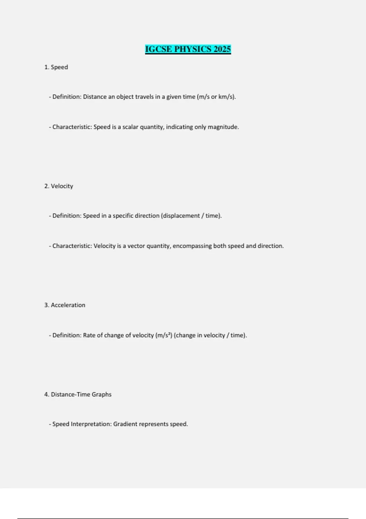 IGCSE PHYSICS 2025 1. Speed - Definition: Distance an object travels in a given time (m/s or km/s). - Characteristic: Speed is a scalar quantity, indicating only magnitude. 2. Velocity - Definition: Speed in a specific direction (displacement / time). - Characteristic: Velocity is a vector quantity, encompassing both speed and direction. 3. Acceleration - Definition: Rate of change of velocity (m/s²) (change in velocity / time). 4. Distance-Time Graphs - Speed Interpretation: Gradient represents speed. - Velocity Changes: Curved lines indicate changing velocity (acceleration or deceleration). 5. Speed-Time Graphs - Acceleration Interpretation: Gradient indicates acceleration. - Distance Measurement: Area under the line represents distance. - Constant Speed: Horizontal line indicates constant speed (though velocity can still change). 6. Acceleration Due to Gravity - Description: Objects in free fall near Earth experience a constant acceleration (9.8 m/s²) due to gravity. - Air Resistance: Slows down objects. - Terminal Velocity: Reached when gravitational force equals air resistance (no net force acting). 7. Mass and Weight - Mass: Measure of the amount of matter in an object, with all masses exhibiting inertia. - Weight: Gravitational force acting on mass. 8. Density 9. Forces - Effects: Can change the shape and accelerate an object. 10. Effect of Forces on a Spring (Changing Shape) - Experimental Procedure: Steps to measure and plot spring extension against force. - Graph Annotation: Shows direct proportionality of extension to force until the limit of proportionality is reached. 11. Hooke's Law - Statement: Extension of a spring is directly proportional to the applied force, within the limit of proportionality. - Formula: F = kx (force = spring constant × extension). 12. Force, Mass, and Acceleration 13. Centripetal Force - Definition: Force that directs an object into circular motion, acting perpendicular to the direction of travel toward the center of the orbit. - Characteristic: Does not perform work as it does not move in the direction of fo