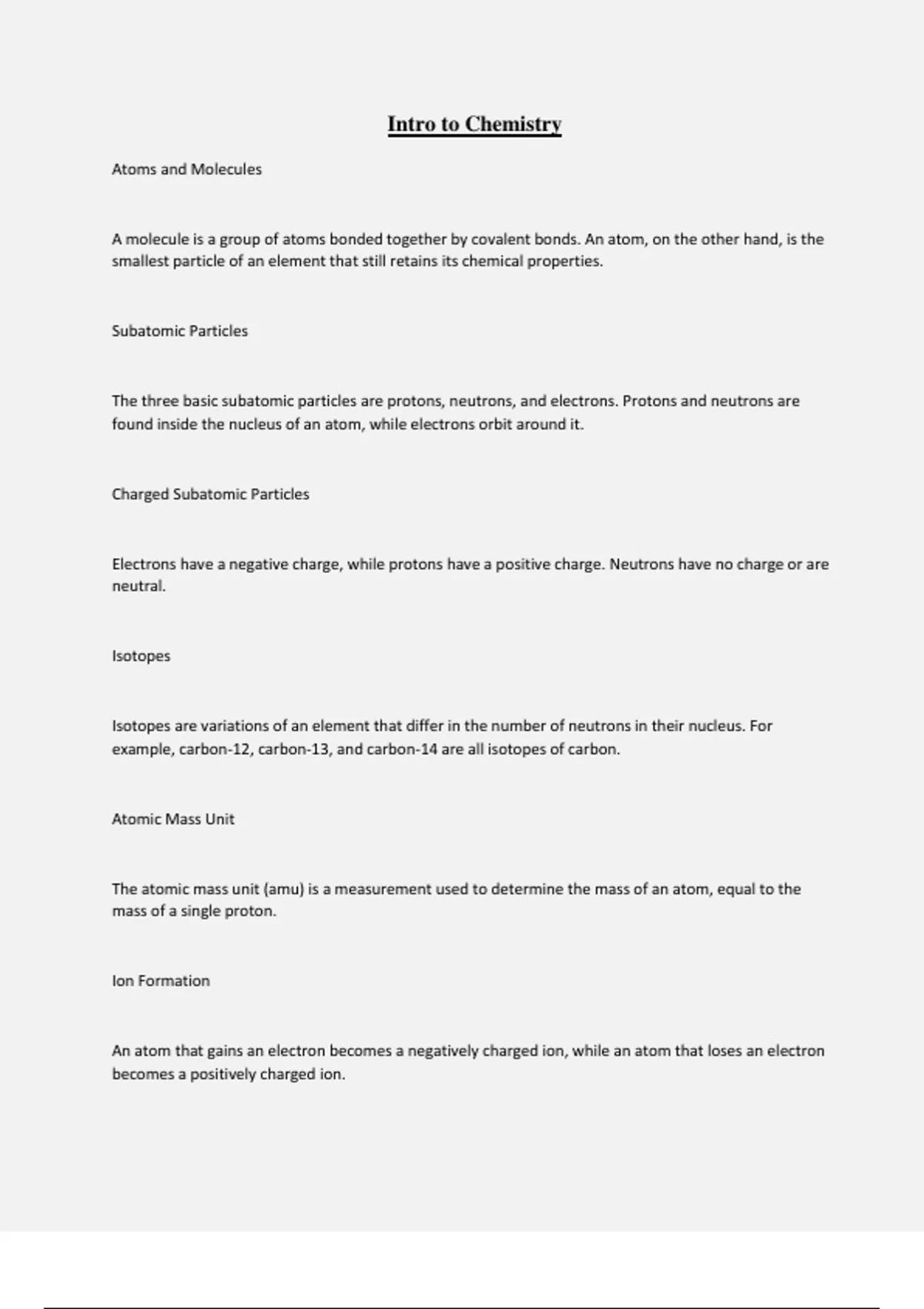 Intro to Chemistry Atoms and Molecules A molecule is a group of atoms bonded together by covalent bonds. An atom, on the other hand, is the smallest particle of an element that still retains its chemical properties. Subatomic Particles The three basic subatomic particles are protons, neutrons, and electrons. Protons and neutrons are found inside the nucleus of an atom, while electrons orbit around it. Charged Subatomic Particles Electrons have a negative charge, while protons have a positive charge. Neutrons have no charge or are neutral. Isotopes Isotopes are variations of an element that differ in the number of neutrons in their nucleus. For example, carbon-12, carbon-13, and carbon-14 are all isotopes of carbon. Atomic Mass Unit The atomic mass unit (amu) is a measurement used to determine the mass of an atom, equal to the mass of a single proton. Ion Formation An atom that gains an electron becomes a negatively charged ion, while an atom that loses an electron becomes a positively charged ion. Determining Number of Neutrons To find the number of neutrons in an atom, subtract the atomic number from the atomic mass. Atomic Number and Number of Electrons The number of electrons in a neutral atom is equal to the atomic number. The atomic number represents the number of protons in an atom. Element Ordering on the Periodic Table Elements are placed in order on the periodic table according to their atomic number, which is the number of protons in an atom. Periodic Table Components The vertical columns on the periodic table are called groups or families, while the horizontal rows are called periods. Group Properties All members of a group on the periodic table have the same number of electrons in their outermost energy level, leading to similar chemical properties. Finding Atomic Information Using the periodic table, we can find that chromium has 24 protons and 28 neutrons. All elements in the same period have the same number of energy levels.