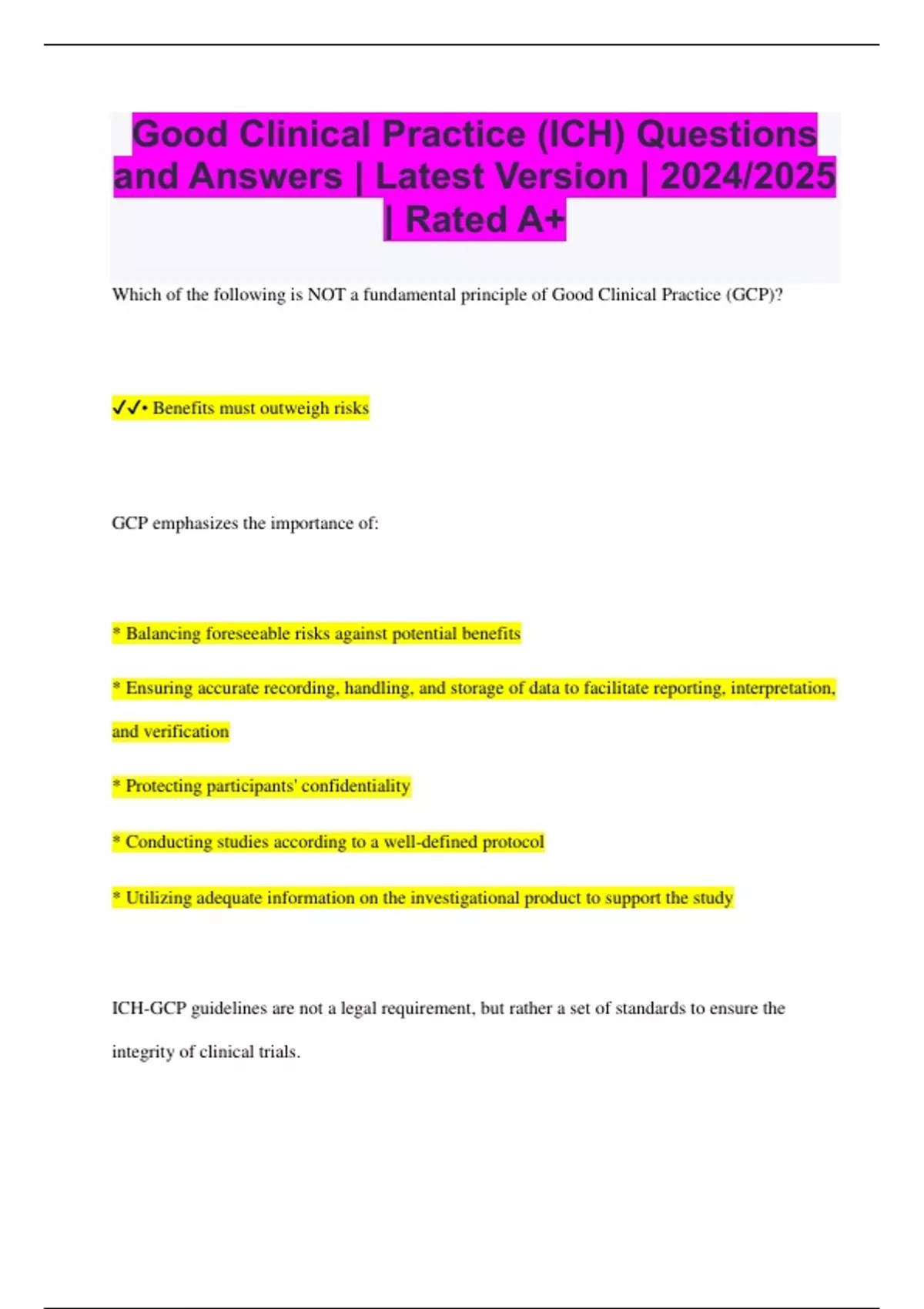 Good Clinical Practice (ICH) Questions and Answers | Latest Version | 2024/2025 | Rated A+ Which of the following is NOT a fundamental principle of Good Clinical Practice (GCP)? • Benefits must outweigh risks GCP emphasizes the importance of: * Balancing foreseeable risks against potential benefits * Ensuring accurate recording, handling, and storage of data to facilitate reporting, interpretation, and verification * Protecting participants' confidentiality * Conducting studies according to a well-defined protocol * Utilizing adequate information on the investigational product to support the study ICH-GCP guidelines are not a legal requirement, but rather a set of standards to ensure the integrity of clinical trials. Why are GCP guidelines important in low- and middle-income countries? • To ensure the highest standards of clinical research and participant protection What is NOT true about the informed consent process? • A participant can withdraw from the study at any time without providing a reason • The participant can sign the consent form before joining the study • Details of alternative treatments/options must be given to participants after they have given consent Informed consent requires: * Obtaining IEC/IRB approval for all participant-related materials and documents * Ensuring participants give consent freely without coercion or undue influence * Allowing participants to withdraw from the study at any time without providing a reason Can a participant's consent form be marked/signed at any time during participation if they cannot read or write? • Yes, as long as the participant has agreed