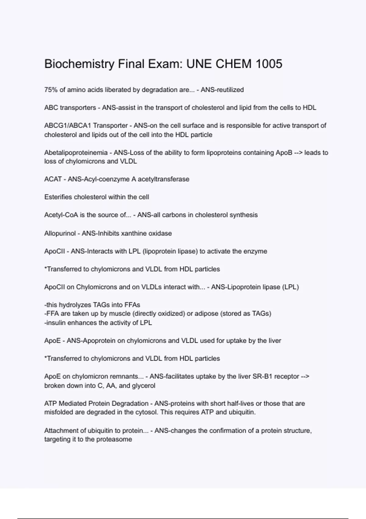 Biochemistry Final Exam: UNE CHEM 1005 with 100% correct answers