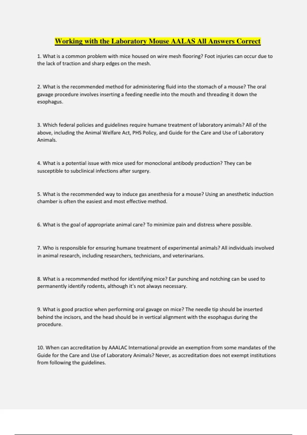 Working with the Laboratory Mouse AALAS All Answers Correct 1. What is a common problem with mice housed on wire mesh flooring? Foot injuries can occur due to the lack of traction and sharp edges on the mesh. 2. What is the recommended method for administering fluid into the stomach of a mouse? The oral gavage procedure involves inserting a feeding needle into the mouth and threading it down the esophagus. 3. Which federal policies and guidelines require humane treatment of laboratory animals? All of the above, including the Animal Welfare Act, PHS Policy, and Guide for the Care and Use of Laboratory Animals. 4. What is a potential issue with mice used for monoclonal antibody production? They can be susceptible to subclinical infections after surgery. 5. What is the recommended way to induce gas anesthesia for a mouse? Using an anesthetic induction chamber is often the easiest and most effective method. 6. What is the goal of appropriate animal care? To minimize pain and distress where possible. 7. Who is responsible for ensuring humane treatment of experimental animals? All individuals involved in animal research, including researchers, technicians, and veterinarians. 8. What is a recommended method for identifying mice? Ear punching and notching can be used to permanently identify rodents, although it's not always necessary. 9. What is good practice when performing oral gavage on mice? The needle tip should be inserted behind the incisors, and the head should be in vertical alignment with the esophagus during the procedure. 10. When can accreditation by AAALAC International provide an exemption from some mandates of the Guide for the Care and Use of Laboratory Animals? Never, as accreditation does not exempt institutions from following the guidelines. 11. What is an injectable anesthetic agent commonly used in mice? Pentobarbital is often used as an injectable anesthetic agent. 12. At what age do mammaries become visible on female mice? Around 9 days of age. 13. Which type of bedding is recommended for postoperative housing for mice? Paper bedding material can help keep the animals clean and comfortable. 14. What is a common use of injectable anesthesia in mice? It can be used for procedures such as IP injections, blood collection, or surgery. 15. How deep should a needle be inserted for IP injection in mice? Typically, it's recommended to insert the needle 0.5 cm deep. What is the age range when mice are weaned? ️21-28 days While restraining a mouse, a technician should check for which of the following? ️All of the Above Which measure can correct respiratory depression in anesthetized mice? ️All of the Above Which of the following represents an appropriate technique for subcutaneous injections in mice? ️Lift some skin on the back of the mouse, and insert the needle into the base of the tent. How are Salmonella spp. typically transmitted from animals to humans? ️By the fecal-oral route When picking up a mouse from a filter top cage, putting the wire bar lid sideways on the cage is helpful to: ️Reposition your grasp as you take the mouse out of the cage as it will tend to hold on to the wire bar lid. What potential problem(s) should you be aware of when mice are undergoing surgical procedures? ️All of the Above Which of the following would provide longer-acting pain relief in mice? ️Ca