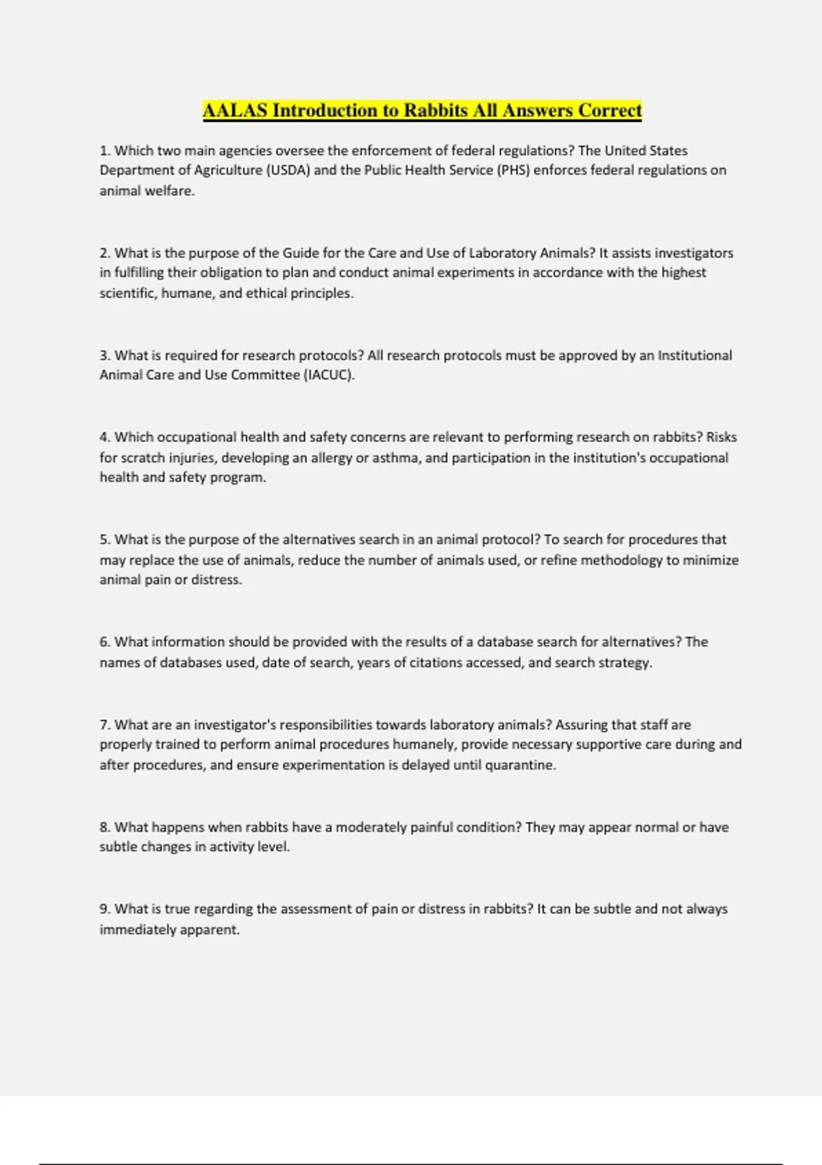 AALAS Introduction to Rabbits All Answers Correct 1. Which two main agencies oversee the enforcement of federal regulations? The United States Department of Agriculture (USDA) and the Public Health Service (PHS) enforces federal regulations on animal welfare. 2. What is the purpose of the Guide for the Care and Use of Laboratory Animals? It assists investigators in fulfilling their obligation to plan and conduct animal experiments in accordance with the highest scientific, humane, and ethical principles. 3. What is required for research protocols? All research protocols must be approved by an Institutional Animal Care and Use Committee (IACUC). 4. Which occupational health and safety concerns are relevant to performing research on rabbits? Risks for scratch injuries, developing an allergy or asthma, and participation in the institution's occupational health and safety program. 5. What is the purpose of the alternatives search in an animal protocol? To search for procedures that may replace the use of animals, reduce the number of animals used, or refine methodology to minimize animal pain or distress. 6. What information should be provided with the results of a database search for alternatives? The names of databases used, date of search, years of citations accessed, and search strategy. 7. What are an investigator's responsibilities towards laboratory animals? Assuring that staff are properly trained to perform animal procedures humanely, provide necessary supportive care during and after procedures, and ensure experimentation is delayed until quarantine. 8. What happens when rabbits have a moderately painful condition? They may appear normal or have subtle changes in activity level. 9. What is true regarding the assessment of pain or distress in rabbits? It can be subtle and not always immediately apparent. 10. Why is FCA considered a painful procedure? The USDA deems it a painful procedure due to its use in immunizations. 11. What is required for survival surgical procedures in rabbits? The use of aseptic technique is necessary to ensure humane treatment and prevent infection.