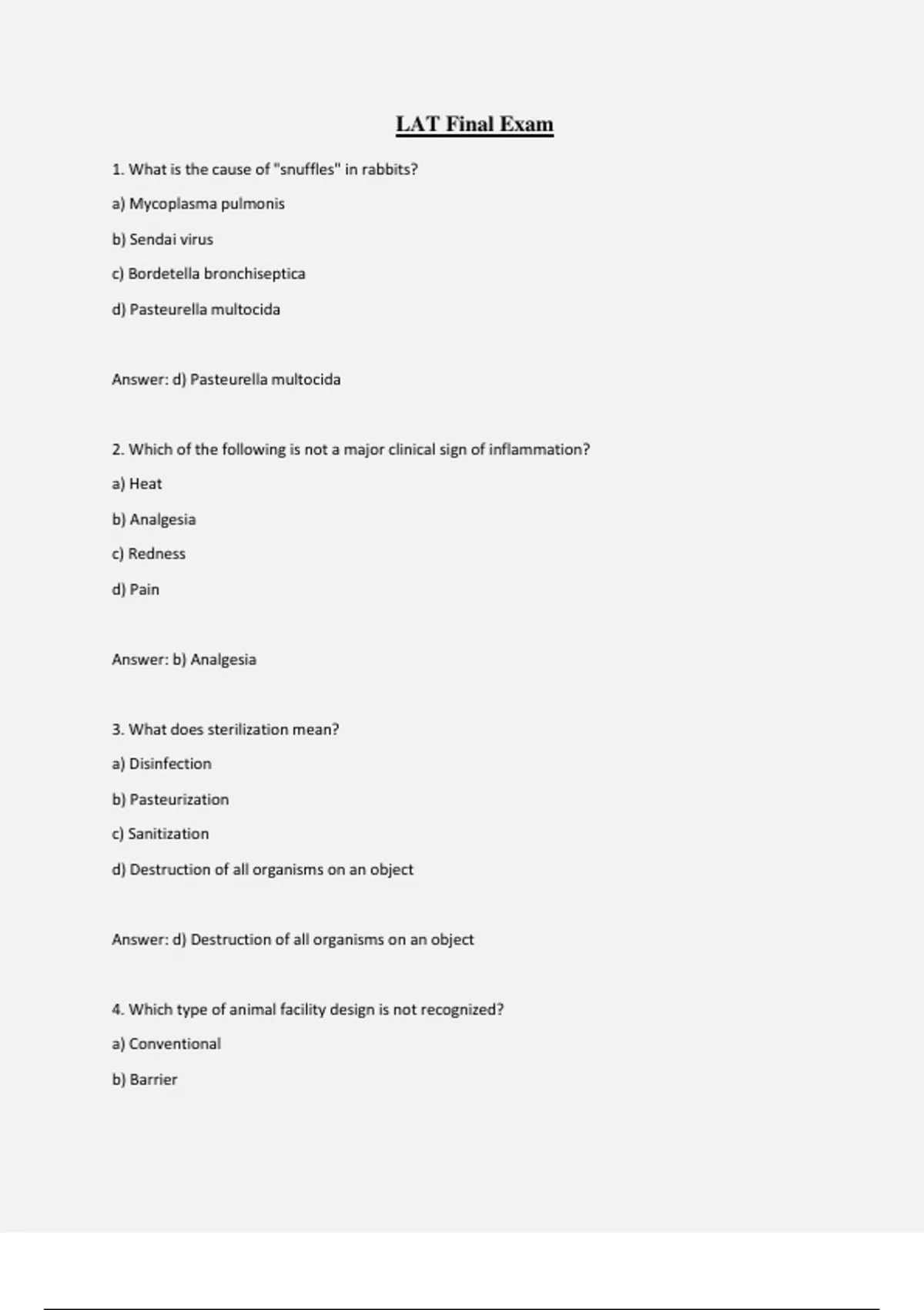 LAT Final Exam 1. What is the cause of "snuffles" in rabbits? a) Mycoplasma pulmonis b) Sendai virus c) Bordetella bronchiseptica d) Pasteurella multocida Answer: d) Pasteurella multocida 2. Which of the following is not a major clinical sign of inflammation? a) Heat b) Analgesia c) Redness d) Pain Answer: b) Analgesia 3. What does sterilization mean? a) Disinfection b) Pasteurization c) Sanitization d) Destruction of all organisms on an object Answer: d) Destruction of all organisms on an object 4. Which type of animal facility design is not recognized? a) Conventional b) Barrier c) VAF/SPF d) Clean/Dirty Answer: c) VAF/SPF 5. Which regulatory agency performs annual unannounced site inspections and enforces the Animal Welfare Act? a) AAALAC, Int. b) FDA c) PHS d) USDA Answer: d) USDA 6. What type of pathology focuses on the study of diseased tissues at a microscopic level? a) Topical b) Clinical c) Microscopic d) Anatomical Answer: c) Microscopic 7. Which type of animals are reared in open (non-filtered) cages with an unknown mic