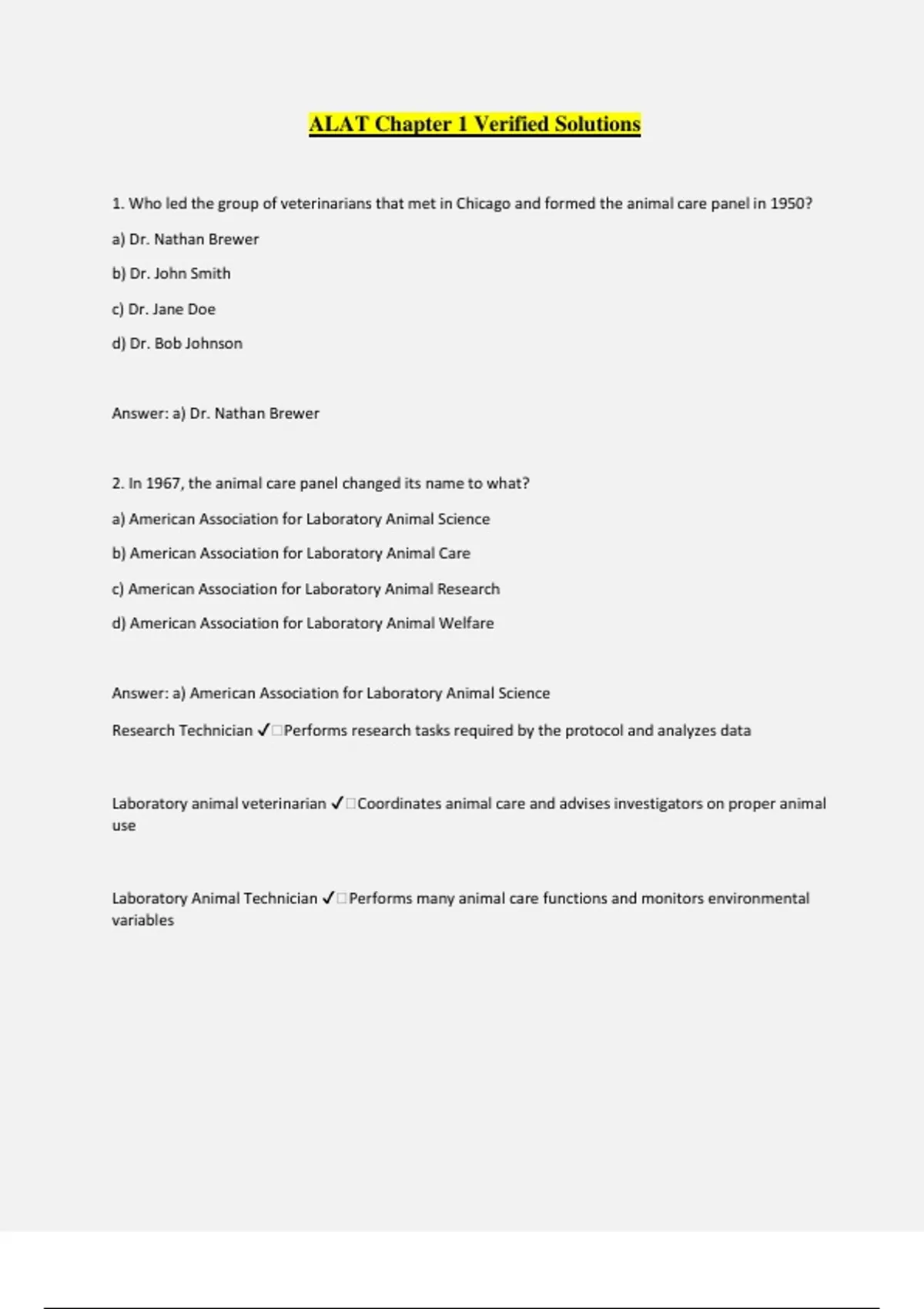 ALAT Chapter 1 Verified Solutions 1. Who led the group of veterinarians that met in Chicago and formed the animal care panel in 1950? a) Dr. Nathan Brewer b) Dr. John Smith c) Dr. Jane Doe d) Dr. Bob Johnson Answer: a) Dr. Nathan Brewer 2. In 1967, the animal care panel changed its name to what? a) American Association for Laboratory Animal Science b) American Association for Laboratory Animal Care c) American Association for Laboratory Animal Research d) American Association for Laboratory Animal Welfare Answer: a) American Association for Laboratory Animal Science Research Technician ️Performs research tasks required by the protocol and analyzes data Laboratory animal veterinarian ️Coordinates animal care and advises investigators on proper animal use Laboratory Animal Technician ️Performs many animal care functions and monitors environmental variables