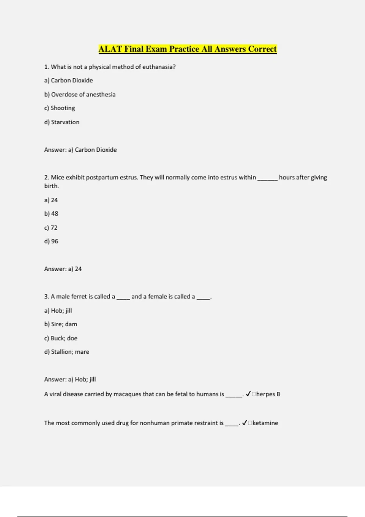 ALAT Final Exam Practice All Answers Correct 1. What is not a physical method of euthanasia? a) Carbon Dioxide b) Overdose of anesthesia c) Shooting d) Starvation Answer: a) Carbon Dioxide 2. Mice exhibit postpartum estrus. They will normally come into estrus within ______ hours after giving birth. a) 24 b) 48 c) 72 d) 96 Answer: a) 24 3. A male ferret is called a ____ and a female is called a ____. a) Hob; jill b) Sire; dam c) Buck; doe d) Stallion; mare Answer: a) Hob; jill A viral disease carried by macaques that can be fetal to humans is _____. ️herpes B The most commonly used drug for nonhuman primate restraint is ____. ️ketamine T/F Squirrel monkeys develop sex skin. ️False Whichi nonhuman primate commonly gives birth to twins? ️Marmosets Facilities housing nonhuman primates should perform TB testing a minimum of ____ times per year. ️Two When TB testing nonhuman primate, the route of administration of tuberculin into the eyelid is ____. ️Intradermal Guinea pig offspring are born precocious, the term means ______. ️fully furred, eyes open, able to run and eat solid food at birth The normal gestation length for the hamster is _____days. ️15-16 days The normal gestation length for the gerbil is _____days. ️24-26 days T/F A Bollman cage is a commonly used restraint method in swine. ️Fales