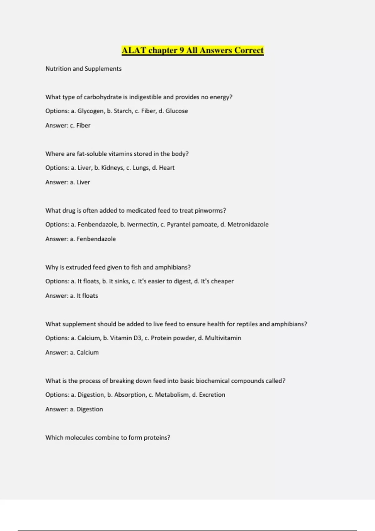 ALAT chapter 9 All Answers Correct Nutrition and Supplements What type of carbohydrate is indigestible and provides no energy? Options: a. Glycogen, b. Starch, c. Fiber, d. Glucose Answer: c. Fiber Where are fat-soluble vitamins stored in the body? Options: a. Liver, b. Kidneys, c. Lungs, d. Heart Answer: a. Liver What drug is often added to medicated feed to treat pinworms? Options: a. Fenbendazole, b. Ivermectin, c. Pyrantel pamoate, d. Metronidazole Answer: a. Fenbendazole Why is extruded feed given to fish and amphibians? Options: a. It floats, b. It sinks, c. It's easier to digest, d. It's cheaper Answer: a. It floats What supplement should be added to live feed to ensure health for reptiles and amphibians? Options: a. Calcium, b. Vitamin D3, c. Protein powder, d. Multivitamin Answer: a. Calcium What is the process of breaking down feed into basic biochemical compounds called? Options: a. Digestion, b. Absorption, c. Metabolism, d. Excretion Answer: a. Digestion Which molecules combine to form proteins? Options: a. Carbohydrates and fats, b. Amino acids, c. Vitamins and minerals, d. Proteins and starch Answer: b. Amino acids What is usually added to animals' drinking water to prevent the growth of Pseudomonas aeruginosa? Options: a. Acid, b. Base, c. Salt, d. Sugar Answer: a. Acid What is the difference between essential and non-essential nutrients? Options: a. Essential nutrients are produced in the body; non-essential nutrients are not produced in the body b. Essential nutrients are not produced in the body; non-essential nutrients are produced in the body c. Essential nutrients are produced in small amounts; non-essential nutrients are produced in large amounts d. Essential nutrients are produced through normal body metabolism; non-essential nutrients are not produced through normal body metabolism Answer: d. Essential nutrients are produced through normal body metabolism; non-essential nutrients are not produced through normal body metabolism What is the name of the disease caused by lack of calcium in young animals that leads to thinning of the bones? Options: a. Rickets, b. Anemia, c. Osteoporosis, d. Scurvy Answer: a. Rickets Why should animals be given fiber as a component of their diet? ️Fiber is imporant for efficient and effective digestion in many laboratory animal species A deficiency of this can lead to anemia ️Iron electrolytes are ️sodium and chloride Fat soluable vitamins ️Vitamins A, D, E, K This cannot be synthesized by NHP's or guiena pigs ️Vitamin C This deficiency can lead to thinning of the bones ️Calcium Why must water soulable vitamins be supplied to an animal on a daily basis? ️because they are no easily stored by the body