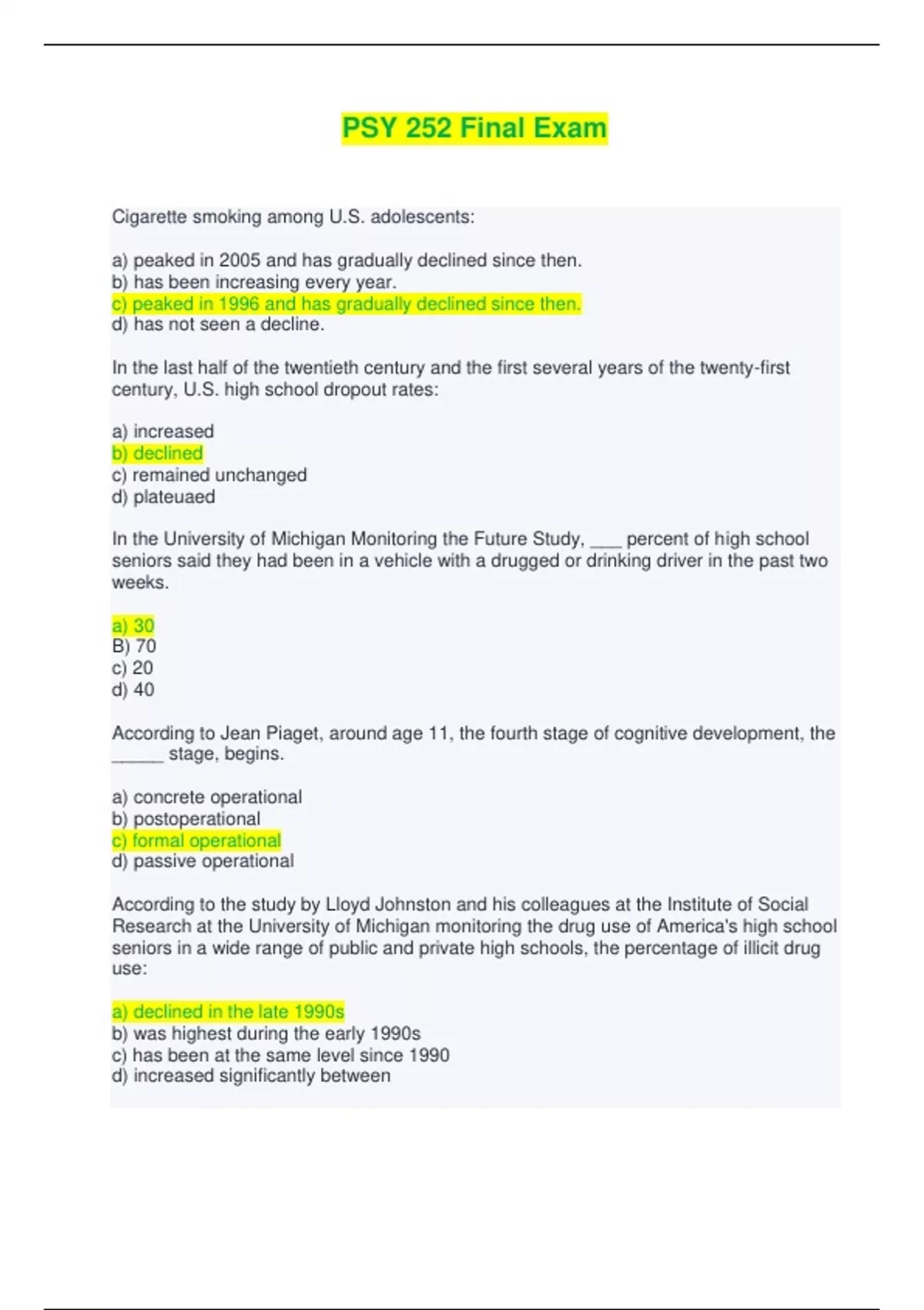 PSY 252 Final Exam | Questions and Answers (Complete Solutions) Cigarette smoking among U.S. adolescents: a) peaked in 2005 and has gradually declined since then. b) has been increasing every year. c) peaked in 1996 and has gradually declined since then. d) has not seen a decline. In the last half of the twentieth century and the first several years of the twenty-first century, U.S. high school dropout rates: a) increased b) declined c) remained unchanged d) plateuaed In the University of Michigan Monitoring the Future Study, ___ percent of high school seniors said they had been in a vehicle with a drugged or drinking driver in the past two weeks. a) 30 B) 70 c) 20 d) 40 According to Jean Piaget, around age 11, the fourth stage of cognitive development, the _____ stage, begins. a) concrete operational b) postoperational c) formal operational d) passive operational According to the study by Lloyd Johnston and his colleagues at the Institute of Social Research at the University of Michigan monitoring the drug use of America's high school seniors in a wide range of public and private high schools, the percentage of illicit drug use: a) declined in the late 1990s b) was highest during the early 1990s c) has been at the same level since 1990 d) increased significantly between Who is the founder of the present field of cognitive development? a) Jean Piaget b) Lawrence Kohlberg c) Albert Bandura d) Erik Erikson In the sixth grade, early-maturing girls show____ with their figures than do late-maturing girls, but by the tenth grade late-maturing girls are more ____. a) greater satisfaction: satisfied b) less confidence; conflicted c) greater preoccupation: preoccupied d) more unhappiness; unhappy Anorexia nervosa is about ____likely to occur in females than males. a) twice more b) 10 times more c) half as d) three times more Leading researcher Charles Nelson proposed the view that, although adolescents are capable of very strong emotions, their prefrontal cortex has not adequately developed to the point at which they can control these passions. His view reflects the rapidly emerging field of ____, which involves connections between development, the brain, and socioemotional processes. a) socioemotional neuroscience b) biosocial neuroscience c) psychosocial neuroscience d) social developmental neuroscience ____ learning is a form of education that promotes social responsibility and service to the community. a) service b) social c) collaborative d) cooperative Which of the following has been found to be true about binge drinking? a) binge drinking has declined among high school seniors since 1980. b) binge drinking has increased for students in the eighth grade in recent years c) binge drinking has increased for students in the tenth grade in recent years d) females engage in more binge drinking than males In the Berkeley Longitudinal Study some years ago, early-maturing boys perceived themselves ___ than did their late-maturing counter parts. When the late-Maturing boys were in the their thirties, however, they had developed a ___ than the early-maturing boys had. a) as an anomaly; stronger feeling of inadequacy b) more positively; stronger sense of identity c) as misfits; a more negative self-image d) more negatively; deeper sense of regret When Daniel Offer and his colleagues studied the self-images of adolescents in the United States, Australia, Bangladesh, Hungary, Israel, Italy, Japan, Taiwan, and West Germany, at least _____ percent of the adolescents displayed a healthy self-image. a) 25 b) 48 c) 60 d) 73 Which of the following statements about the timing and variations in puberty is true? a) children in European countries mature up to a year earlier than their American counterparts. b) For girls, menarche is considered within the normal range if it appears between the ages of 9 and 15. c) Genes have little to do with when and how puberty develops d) Non-Latino white girls experience puberty earlier than African American girls According to the National Youth Risk Survey, ____ boys exercised the most and ____ girls exercised the least among adolescents is the U.S. a) Latino; Latina b) African American; non-Latino White c) Latino; African American d) non-Latino White; African American Identity development: a) is a single, neat process b) gets done in bits and pieces c) happens cataclysmically d) involves making decisions once and for all Which of the following statements about identity development is true? a) synthesizing the identity components is a single, neat process in normal individuals. b) decisions about identity may take time, but once they are made, they are set for life c) identity development occurs in a single, one-step process. d) identity encompasses an individual's personality characteristics Most adolescents from ethnic minority groups develop a ____ identity. a) bicultural b) bilingual c) mixed-cultural d) monocultural Which of the following is the third-leading cause of death in 10 to 19 year olds today in the United States? a) Homicide b) suicide c) MVA d) infectious diseases Late bloomers comprise approximately 10 percent ___ who say that they have had no experience with romantic relationships. a) 14 to 16 year olds b) 17 to 19 year olds c) 12 to 13 year olds d) 15 to 16 year olds At ____ years of age, romantic relations are characterized by strong emotional bonds more closely resembling those in adult romantic relationships. a) 12 to 15 b) 11 to 13 c) 14 to 16 d) 17 to 19 Adolescents who do not successfully resolve their identity crisis suffer from what Erikson calls ___. a) identity diffusion b) unresolved identity c) identity confusion d) identity moratorium Early-onset antisocial behavior: a) has lesser negative developmental outcomes than late-onset antisocial behavior b) is less likely to persist into emerging adulthood c) is associated with more mental health problems d) is not associated with relationship problems, unlike late -onset antisocial behavior Identity _