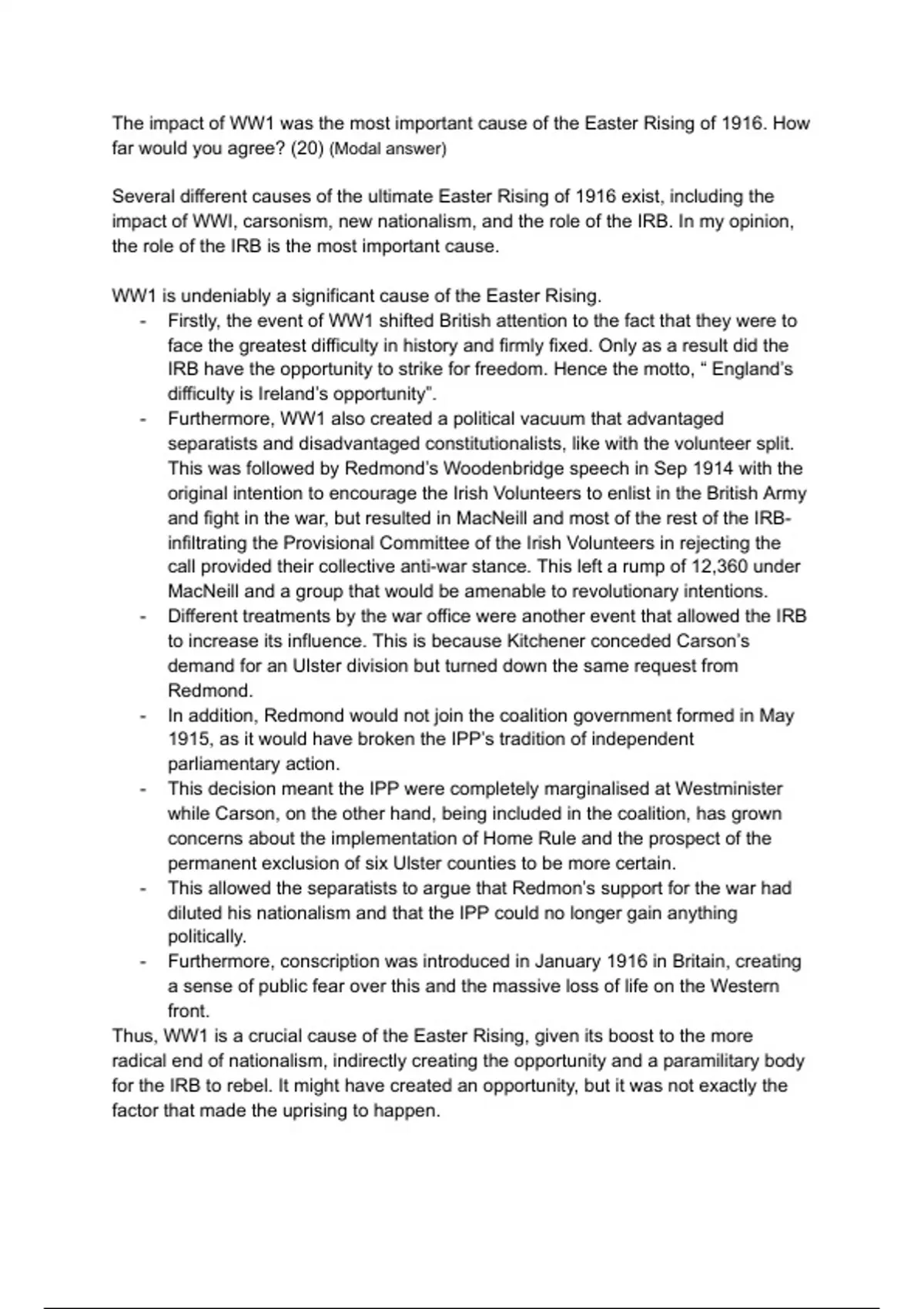 impact of WWI, carsonism, new nationalism, and the role of the IRB. In my opinion,
