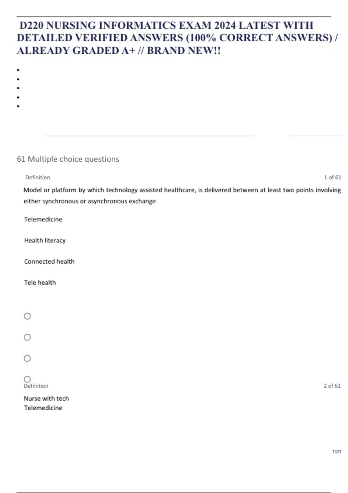 D220 NURSING INFORMATICS EXAM 2024 LATEST WITH DETAILED VERIFIED ANSWERS (100% CORRECT ANSWERS) / ALREADY GRADED A+ // BRAND NEW!!