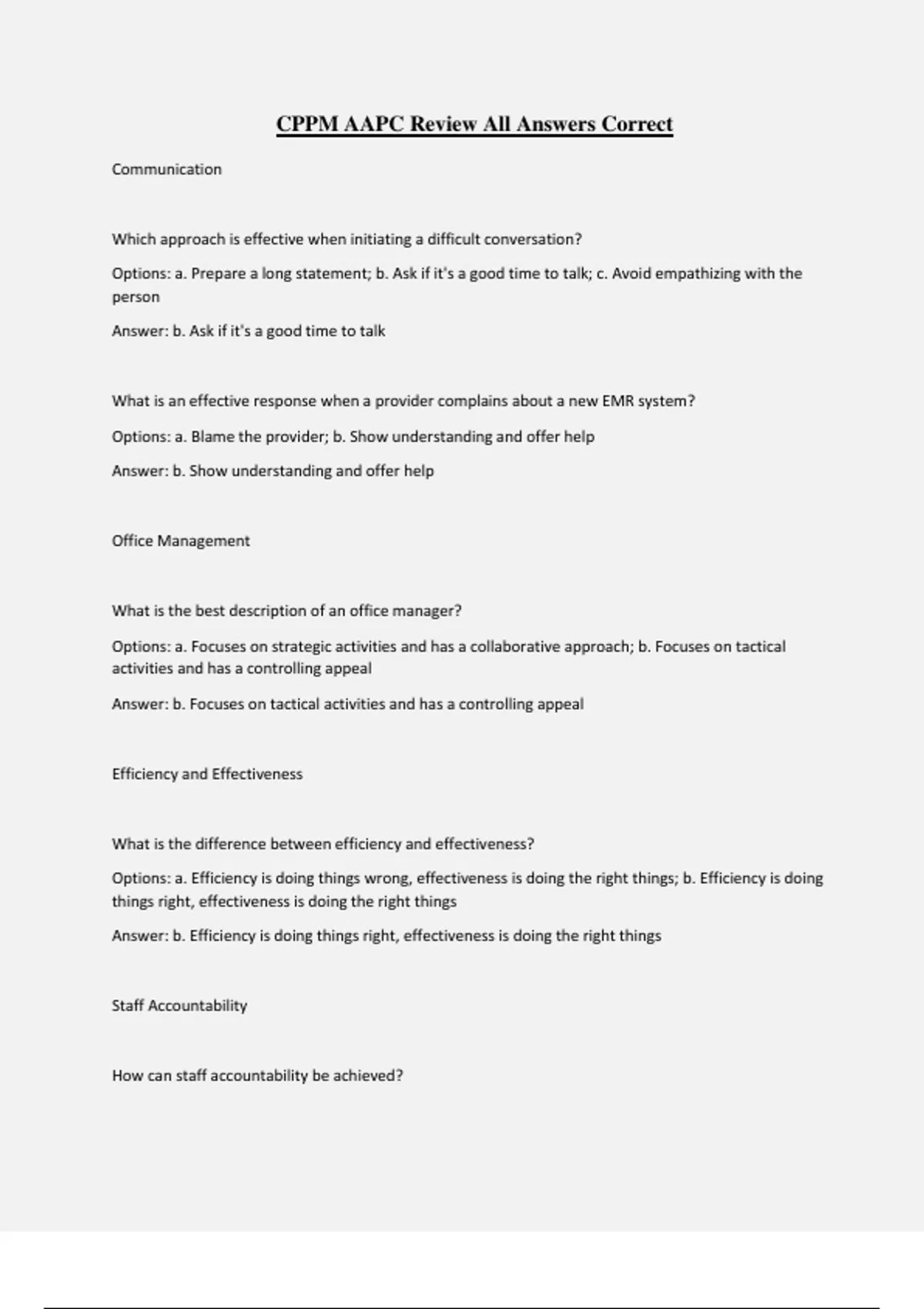 CPPM AAPC Review All Answers Correct Communication Which approach is effective when initiating a difficult conversation? Options: a. Prepare a long statement; b. Ask if it's a good time to talk; c. Avoid empathizing with the person Answer: b. Ask if it's a good time to talk What is an effective response when a provider complains about a new EMR system? Options: a. Blame the provider; b. Show understanding and offer help Answer: b. Show understanding and offer help Office Management What is the best description of an office manager? Options: a. Focuses on strategic activities and has a collaborative approach; b. Focuses on tactical activities and has a controlling appeal Answer: b. Focuses on tactical activities and has a controlling appeal Efficiency and Effectiveness What is the difference between efficiency and effectiveness? Options: a. Efficiency is doing things wrong, effectiveness is doing the right things; b. Efficiency is doing things right, effectiveness is doing the right things Answer: b. Efficiency is doing things right, effectiveness is doing the right things Staff Accountability How can staff accountability be achieved? Options: a. Assigning vague goals; b. Defining responsibility for tasks Answer: b. Defining responsibility for tasks Patient Communication When should staff obtain a photocopy of patient insurance cards? Options: a. When patients leave the office; b. When patients arrive for their appointment Answer: b. When patients arrive for their appointment What is not reported by evaluation nd management codes? Physical therapy evaluations = E/M services are reported for visits made by physicians or other qualified healthcare providers in the office, hospital, and nursing home. Electronic health records guide a provider to select E/M codes based on the number of elements documented. What does this leave out that causes a potential compliance risk? Medical Necessity You are tasked with hiring an employee with inpatient coding experience. Which code set will they need to understand for inpatient procedures? ICD-10-PCS The front desk plays an important role in: Customer service, Optimizing physician time, Claim quality assurance Medicare offers plans for Part A, Part B, Part C, and Part D. Which of these covers inpatient hospital care? Part A A MEDICARE PATIENT IS SEEN IN THE URGENT CARE CLINIC FOLLOWING A MINOR AUTOMOBILE ACCIDENT. THE PATEITN HAS MEDICARE PART A, B,AND C AS WELL AS No-FAULT THROUGH ATUO INSURANCE. WHO IS THE PRIMARY INSURANCE? Automobile No-fault Which is a common reason for denials? The service is not medically necessary. You work for. a pediatric office and the parents of a patient inform you they can No longer afford halter insurance. They do not qualify for Medicaid as their income is too high. What would you recommend? Apply for CHIP coverage Procedure codes are reported by the facility using which code set? ICD-10-PCS - Inpatient Hospital Facilities. Only submitted by FACILITIES! Posting payment and collection policies in a prominent place in your office has what benefit? Prepares the patient to make proper payments at the time of service. There are many elements to a successful appeals process. What is the first and most important process? Analyze the reason for the denial. Which of the following services is covered by Medicare Part B? Physician services Which services meet medical necessity? A lipid panel for a patient with high cholesterol A claim form that is complete and accurate and includes all provider information, member information and other additional information needed to process for payment is called? A clean Claim The Place of Service (POS) code on a claim form is important to determine correct reimbursement. Which statement is correct? The professional component for services provided in a facility (for example, hospital or ASC) are less than when provided in the physicians office because the physician does not have any practice expense at the facility like rent, staff, and supplies. When reviewing denials, your biller notices that one fo the private payers is not paying for venipuncture when performed during an office visit. What should be done? Check the payer contract to see if the denial is appropriate In which kind of a scenario is Medicare the secondary payer? A patient who requires surgery for a fracture hip as a result of a car accident - auto insurance becomes primary payer. When should credentialing of a provider be performed? When it is determined the physician will be hired What is the most important criteria to meet for the selection of Evaluation and management codes? Medical Necessity