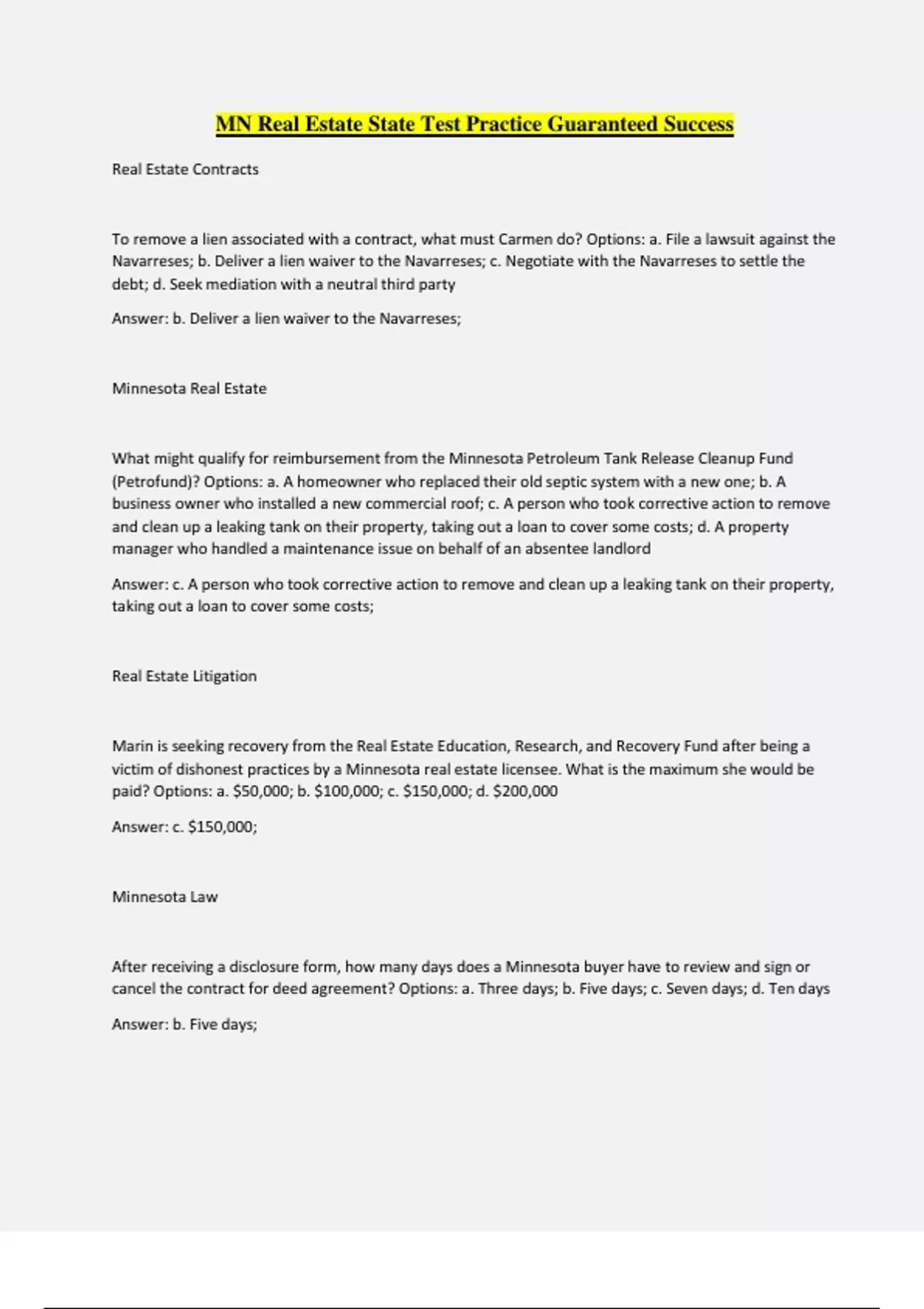 MN Real Estate State Test Practice Guaranteed Success Real Estate Contracts To remove a lien associated with a contract, what must Carmen do? Options: a. File a lawsuit against the Navarreses; b. Deliver a lien waiver to the Navarreses; c. Negotiate with the Navarreses to settle the debt; d. Seek mediation with a neutral third party Answer: b. Deliver a lien waiver to the Navarreses; Minnesota Real Estate What might qualify for reimbursement from the Minnesota Petroleum Tank Release Cleanup Fund (Petrofund)? Options: a. A homeowner who replaced their old septic system with a new one; b. A business owner who installed a new commercial roof; c. A person who took corrective action to remove and clean up a leaking tank on their property, taking out a loan to cover some costs; d. A property manager who handled a maintenance issue on behalf of an absentee landlord Answer: c. A person who took corrective action to remove and clean up a leaking tank on their property, taking out a loan to cover some costs; Real Estate Litigation Marin is seeking recovery from the Real Estate Education, Research, and Recovery Fund after being a victim of dishonest practices by a Minnesota real estate licensee. What is the maximum she would be paid? Options: a. $50,000; b. $100,000; c. $150,000; d. $200,000 Answer: c. $150,000; Minnesota Law After receiving a disclosure form, how many days does a Minnesota buyer have to review and sign or cancel the contract for deed agreement? Options: a. Three days; b. Five days; c. Seven days; d. Ten days Answer: b. Five days; Janice and Tom's home is subject to foreclosure. Their deed of trust includes a power-of-sale clause. Which form of foreclosure will most likely be used? ️Foreclosure by advertisement Which of the following tanks must be registered with the Minnesota Pollution Control Agency? ️An above-ground, 1,000-gallon tank that's used to store commercially used petroleum Dylan has gotten behind on her mortgage payments. Her mortgage doesn't include a power-of-sale clause. If her lender pursues a foreclosure sale, which process will most likely be used? ️Foreclosure by action, which is a judicial process requiring court supervision What's the Real Estate Education, Research and Recovery Fund fee for a Minnesota license renewal applicant? ️$20 Under the Minnesota statute of frauds, which of the following agreements would NOT be enforceable? ️A homeowner and landscaper entered into a verbal agreement for $1,500 in plants and labor, but the landscaper backed out before any goods or money changed hands. A homestead property owner has failed to pay their taxes by May 15th. What penalty will be assessed on June 1? ️2% In Minnesota, in which of the following situations can you sell subdivided lands without a real estate license? ️When the lots are registered and are being sold as securities In Minnesota, when should you present the agency disclosure form to a potential client? ️At the first substantive contact Gerald purchased a property under a contract for deed arrangement. He missed some payments, received notice that the seller was going to terminate the contract, and today was evicted. Which of the following statements is most likely true? ️Gerald received notice of default at least 60 days ago. Which of the following actions would violate Minnesota statute related to records? ️Not providing the commissioner access to the records in a reasonable time What type of rights to the property does a Minnesota seller have during the contract for deed process? ️Legal title rights What is a subdivision, according to Minnesota's Subdivided Land Act? ️Undeveloped land that is being divided into smaller lots Bartholomew was a practicing real estate licensee in Minnesota, but spent some time dabbling in other careers for a few years before deciding to get back into real estate. He's studying to take the licensing examination again. Which of the following is most likely true? ️It's been at least two years since Bartholomew's last renewal deadline. Wayne is a real estate salesperson in Minnesota. He notified his broker that he no longer wishes to be associated with her, she then notified the commission in writing within 10 days. Which of these is NOT an option for Wayne? ️Continue practicing real estate while finding a new broker to associate with. A listing broker in Minnesota received a commission check from the seller at closing. The broker would be committing a license law violation if he were to deposit the check in a ______ account. ️Trust The broker of Merit Realty in Duluth has become incapacitated. For how long may the temporary broker serve? ️45 days Which of the following occurrences does NOT require the licensee to notify the commission within 10 days? ️Driving under the influence (misdemeanor) charge Genevieve performs real estate activities in Minnesota on behalf of Vern, a real estate broker. What type of license does she have? ️Real estate salesperson Robbie's lender notifies him of an impending foreclosure, and is told that his property will be sold at public auction. Six months after the auction occurs, Robbie receives a notice of eviction for which the lender had to petition a court. What does this describe? ️Foreclosure by advertisement Kuhn received notice that he defaulted on his Minnesota contract for deed arrangement when he missed last month's payment. Since receiving the notice, Kuhn has paid past due amounts, costs