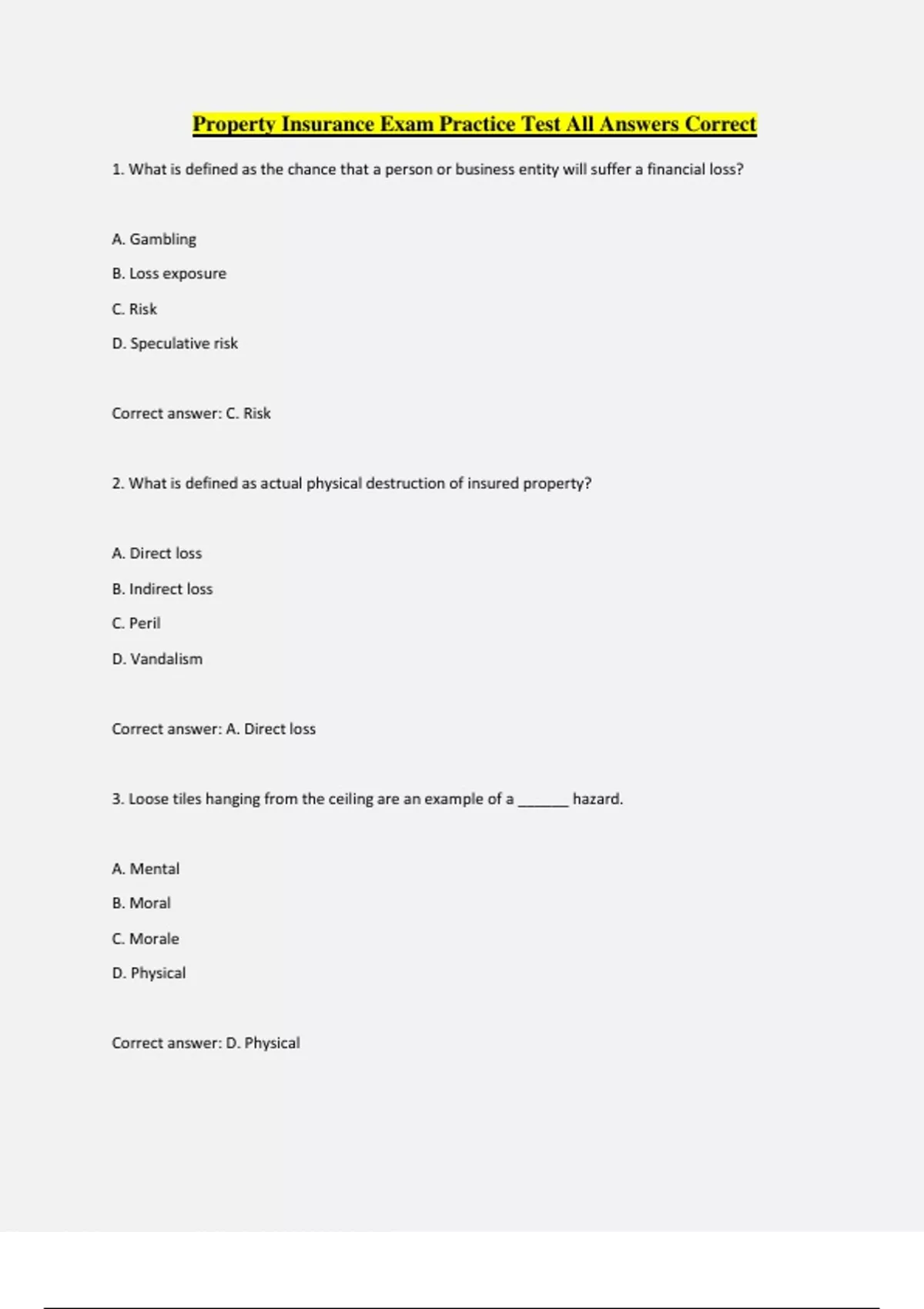 Property Insurance Exam Practice Test All Answers Correct 1. What is defined as the chance that a person or business entity will suffer a financial loss? A. Gambling B. Loss exposure C. Risk D. Speculative risk Correct answer: C. Risk 2. What is defined as actual physical destruction of insured property? A. Direct loss B. Indirect loss C. Peril D. Vandalism Correct answer: A. Direct loss 3. Loose tiles hanging from the ceiling are an example of a ______ hazard. A. Mental B. Moral C. Morale D. Physical Correct answer: D. Physical 4. In a Property Insurance policy, insurable interest must be demonstrated at what point in time? A. At time of application B. At time of first payment C. At time of loss D. All of the above Correct answer: C. At time of loss 5. The primary purpose of the co-insurance condition in a Property Insurance policy is to encourage ______. A. Buying multiple policies B. Insurance to value C. Over-insuring D. Self-insurance Correct answer: B. Insurance to value 6. Who are considered incompetent to contract? A. Illegal aliens B. Mentally challenged citizens C. Minors D. Senior citizens Correct answer: A, B, C (all except D) 7. What are the major causes of loss forms in Commercial Property Insurance, except for? A. Basic B. Broad C. Earthquake D. Special Correct answer: C. Earthquake 8. Extra expense covers: A. Accounting expenses incurred to calculate your loss during a period of restoration B. Additional expenses incurred to continue operation during a period of restoration C. Direct loss of property D.Lost profit during a period of restoration Correct answer: B. Additional expenses incurred to continue operation during a pe
