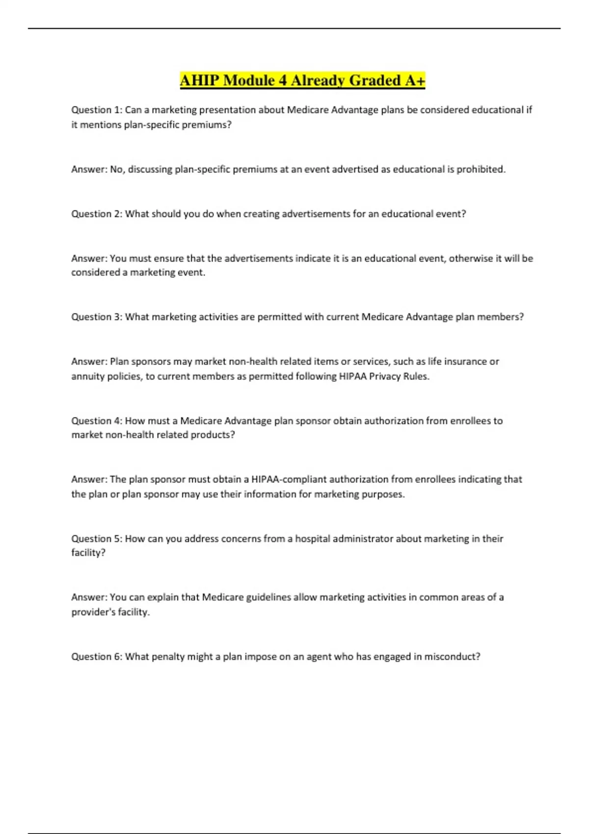AHIP Module 4 Already Graded A+ Question 1: Can a marketing presentation about Medicare Advantage plans be considered educational if it mentions plan-specific premiums? Answer: No, discussing plan-specific premiums at an event advertised as educational is prohibited. Question 2: What should you do when creating advertisements for an educational event? Answer: You must ensure that the advertisements indicate it is an educational event, otherwise it will be considered a marketing event. Question 3: What marketing activities are permitted with current Medicare Advantage plan members? Answer: Plan sponsors may market non-health related items or services, such as life insurance or annuity policies, to current members as permitted following HIPAA Privacy Rules. Question 4: How must a Medicare Advantage plan sponsor obtain authorization from enrollees to market non-health related products? Answer: The plan sponsor must obtain a HIPAA-compliant authorization from enrollees indicating that the plan or plan sponsor may use their information for marketing purposes. Question 5: How can you address concerns from a hospital administrator about marketing in their facility? Answer: You can explain that Medicare guidelines allow marketing activities in common areas of a provider's facility. Question 6: What penalty might a plan impose on an agent who has engaged in misconduct? Answer: The plan may withhold commission, require retraining, report the misconduct to a state department of insurance, or terminate the contract. Question 7: What should you tell a client who asks about Medicare agency recommendations for plans? Answer: Tell her that the Medicare agency does not endorse or recommend any plan. Question 8: What can you do during an appointment with a client who has signed a scope of appointment form? Answer: You can provide her with the required enrollment materials and take her completed enrollment application. Question 9: What should you do before engaging in a discussion about Medicare Advantage options with a beneficiary? Answer: You must have her sign a scope of appointment form, indicating which products she wishes to discuss, and then proceed with the discussion. Question 10: How should you respond to a colleague who suggests targeting specific neighborhoods based on income levels? Answer: This could be considered discriminatory activity and is prohibited. Question 11: Can you present a program about MA-PD plans to residents of an assisted living facility at your friend's request? Answer: Yes, you appreciate the opportunity and can schedule an appointment with anyone at their request. Question 12: What statement best describes the marketing and compliance rules that apply to Agent Armstrong? Answer: Agent Armstrong needs to be licensed and appointed in every state where beneficiaries he markets ABC MA plans are located. Question 13: What advice should you give Miguel Sanchez during the MA-OEP?