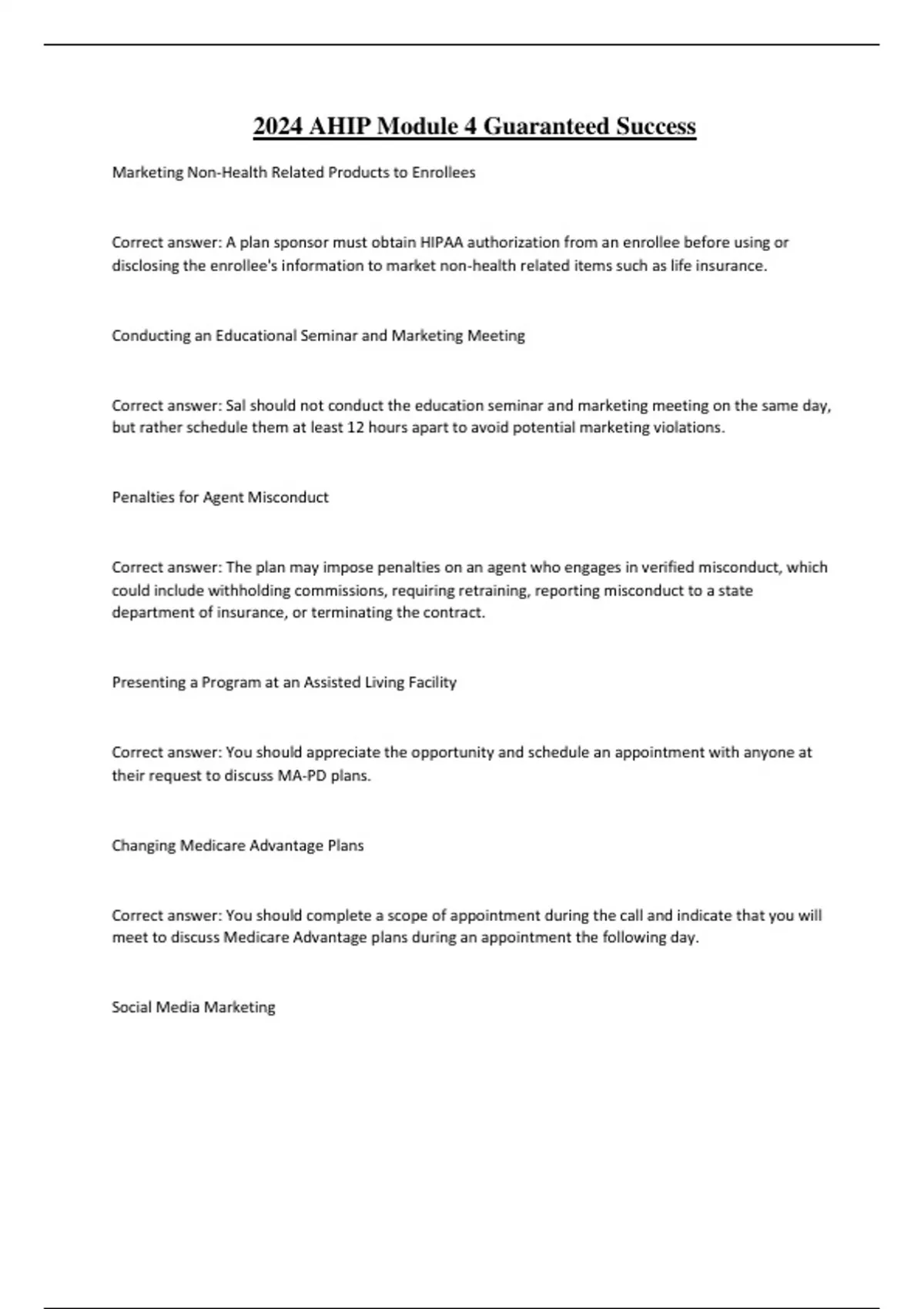 2024 AHIP Module 4 Guaranteed Success Marketing Non-Health Related Products to Enrollees Correct answer: A plan sponsor must obtain HIPAA authorization from an enrollee before using or disclosing the enrollee's information to market non-health related items such as life insurance. Conducting an Educational Seminar and Marketing Meeting Correct answer: Sal should not conduct the education seminar and marketing meeting on the same day, but rather schedule them at least 12 hours apart to avoid potential marketing violations. Penalties for Agent Misconduct Correct answer: The plan may impose penalties on an agent who engages in verified misconduct, which could include withholding commissions, requiring retraining, reporting misconduct to a state department of insurance, or terminating the contract. Presenting a Program at an Assisted Living Facility Correct answer: You should appreciate the opportunity and schedule an appointment with anyone at their request to discuss MA-PD plans. Changing Medicare Advantage Plans Correct answer: You should complete a scope of appointment during the call and indicate that you will meet to discuss Medicare Advantage plans during an appointment the following day. Social Media Marketing Correct answer: As soon as CMS approves Best Care's social media posts, Agent Meadows can post a tweet stating that Best Care offers an array of Medicare Advantage benefit packages and invite prospects to call her for more information. Scope of Appointment and Enrollment Correct answer: You may provide Mrs. Lu with enrollment materials and take her completed enrollment application during the appointment. Providing Meals During Sales Presentations Correct answer: You are permitted to provide light snacks, but a Thanksgiving-style meal would be prohibited, regardless of who provides or pays for the meal. Email Marketing Correct answer: Marketing representatives may initiate electronic contact through email, but an opt-out process must be provided. Addressing Hospital Administrator Concerns Correct answer: You should explain that Medicare guidelines allow marketing activities in common areas of health care facilities. Hospital Marketing Request Correct answer: You should assure the hospital administrator that marketing in health care facilities is an acceptable practice as long as it takes place in common areas where patients are not receiving health care services. Educational Session at Senior Citizens Center