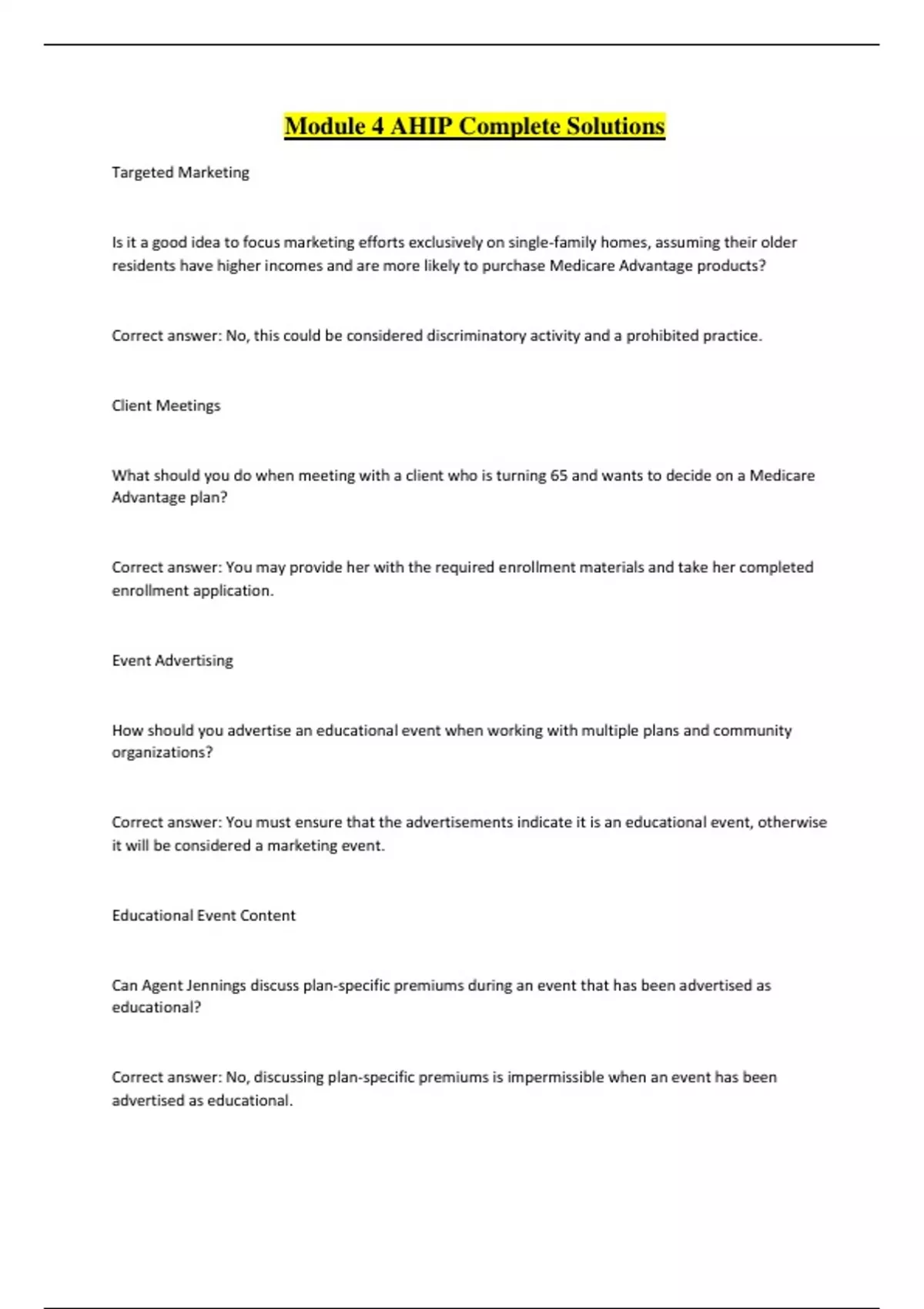 Module 4 AHIP Complete Solutions Targeted Marketing Is it a good idea to focus marketing efforts exclusively on single-family homes, assuming their older residents have higher incomes and are more likely to purchase Medicare Advantage products? Correct answer: No, this could be considered discriminatory activity and a prohibited practice. Client Meetings What should you do when meeting with a client who is turning 65 and wants to decide on a Medicare Advantage plan? Correct answer: You may provide her with the required enrollment materials and take her completed enrollment application. Event Advertising How should you advertise an educational event when working with multiple plans and community organizations? Correct answer: You must ensure that the advertisements indicate it is an educational event, otherwise it will be considered a marketing event. Educational Event Content Can Agent Jennings discuss plan-specific premiums during an event that has been advertised as educational? Correct answer: No, discussing plan-specific premiums is impermissible when an event has been advertised as educational. Door Prizes What types of gifts or prizes are not allowed at a sales event? Correct answer: Gift cards or gift certificates of $15 or less that can be readily converted to cash. Agent Licensing What requirements apply to Agent Armstrong, who markets Medicare Advantage plans with which his agency has contracts? Correct answer: Agent Armstrong needs to be licensed and appointed in every state in which beneficiaries to whom he markets ABC MA plans are located. Scope of Appointment What should you do before discussing Medicare Advantage options with a client? Correct answer: You must have her sign a scope of appointment form, indicating which products she wishes to discuss. You may then proceed with the discussion. Meals What is permitted when marketing Medicare Advantage and Part D plans regarding meals? Correct answer: You may provide light snacks, but a Thanksgiving-style meal would be prohibited, regardless of who provides or pays for the meal. Social Media How can Agent Meadows promote Best Care's Medicare Advantage plan offering comprehensive dental benefits for $15 per month on social media? Correct answer: If permitted under the terms of her contract, Agent Meadows could post a tweet stating that "Best Care offers an array of Medicare Advantage benefit packages. One might be right for you. Call me to find out more!" MA-OEP What advice should you give Miguel Sanchez regarding what he can do during the Medicare Advantage Open Enrollment Period (MA-OEP)? Correct answer: During the MA-OEP, Miguel can have one-on-one meetings with beneficiaries who have requested such meetings.