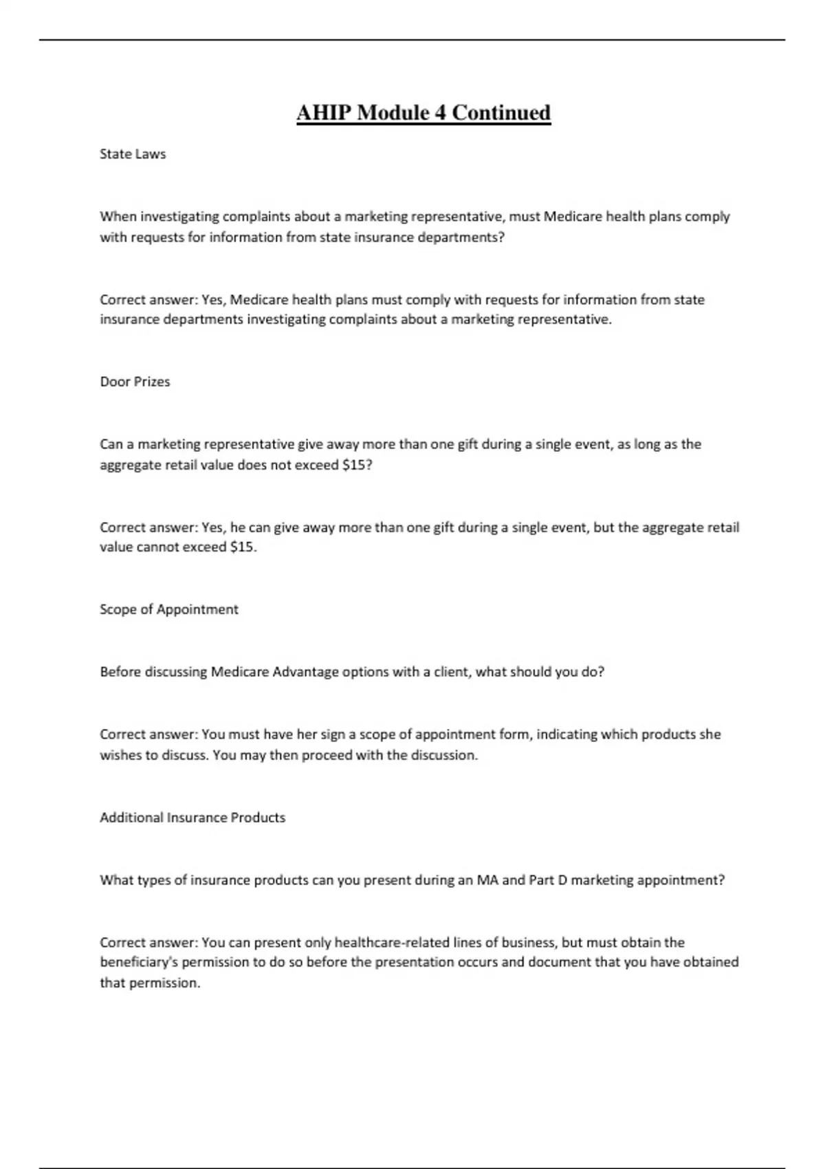 AHIP Module 4 Continued State Laws When investigating complaints about a marketing representative, must Medicare health plans comply with requests for information from state insurance departments? Correct answer: Yes, Medicare health plans must comply with requests for information from state insurance departments investigating complaints about a marketing representative. Door Prizes Can a marketing representative give away more than one gift during a single event, as long as the aggregate retail value does not exceed $15? Correct answer: Yes, he can give away more than one gift during a single event, but the aggregate retail value cannot exceed $15. Scope of Appointment Before discussing Medicare Advantage options with a client, what should you do? Correct answer: You must have her sign a scope of appointment form, indicating which products she wishes to discuss. You may then proceed with the discussion. Additional Insurance Products What types of insurance products can you present during an MA and Part D marketing appointment? Correct answer: You can present only healthcare-related lines of business, but must obtain the beneficiary's permission to do so before the presentation occurs and document that you have obtained that permission. Disenrollment What happens to Agent Lopez's compensation if Ralph disenrolls from Top Choice Medicare Advantage plan within three months of enrollment? Correct answer: Agent Lopez's entire compensation must be recouped because Ralph disenrolled within three months of enrollment. Presenting to Seniors Can you present a program for seniors about MA-PD plans you market? Correct answer: Yes, you can appreciate the opportunity and would be happy to schedule an appointment with anyone at their request. Gifts What types of gifts can you offer to induce enrollment in a plan when marketing Medicare Advantage and Part D plans? Correct answer: You may provide gifts or prizes to all potential enrollees during an event that do not exceed $15 in retail value. Marketing Materials What do you need to do with your materials before using them for marketing purposes when marketing Medicare Advantage and Part D plans? Correct answer: You must submit your materials to the plan you represent, so CMS can review and approve the materials to ensure they are accurate. Meals What are you permitted to do with respect to meals when marketing Medicare Advantage and Part D plans? Correct answer: You may provide light snacks, but a