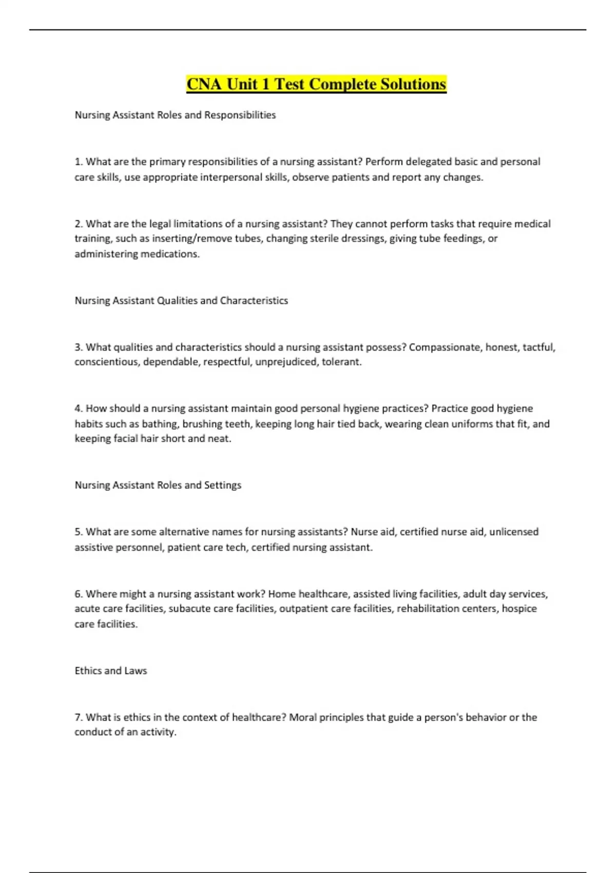 CNA Unit 1 Test Complete Solutions Nursing Assistant Roles and Responsibilities 1. What are the primary responsibilities of a nursing assistant? Perform delegated basic and personal care skills, use appropriate interpersonal skills, observe patients and report any changes. 2. What are the legal limitations of a nursing assistant? They cannot perform tasks that require medical training, such as inserting/remove tubes, changing sterile dressings, giving tube feedings, or administering medications. Nursing Assistant Qualities and Characteristics 3. What qualities and characteristics should a nursing assistant possess? Compassionate, honest, tactful, conscientious, dependable, respectful, unprejudiced, tolerant. 4. How should a nursing assistant maintain good personal hygiene practices? Practice good hygiene habits such as bathing, brushing teeth, keeping long hair tied back, wearing clean uniforms that fit, and keeping facial hair short and neat. Nursing Assistant Roles and Settings 5. What are some alternative names for nursing assistants? Nurse aid, certified nurse aid, unlicensed assistive personnel, patient care tech, certified nursing assistant. 6. Where might a nursing assistant work? Home healthcare, assisted living facilities, adult day services, acute care facilities, subacute care facilities, outpatient care facilities, rehabilitation centers, hospice care facilities. Ethics and Laws 7. What is ethics in the context of healthcare? Moral principles that guide a person's behavior or the conduct of an activity. 8. What are the ethical standards for nursing assistants? Be honest, protect privacy, report abuse, follow the care plan, do not perform tasks outside the scope of practice, report observations accurately, document accurately, follow safety rules. Patient Rights 9. What are patient rights in healthcare? The right to quality of life, services and activities to maintain wellness, full disclosure of rights, participation in own care decisions, privacy, dignity and respect. 10. What are advanced directives in healthcare? Legal documents that allow individuals to choose medical care if they cannot make decisions themselves. Safety and Infection Control 11. How can a nursing assistant prevent injuries in the elderly? Use proper body mechanics when lifting or moving patients. 12. What are the guidelines for good body mechanics? Feet shoulder-width apart when lifting heavy objects; bend knees to lift objects. 13. What are the elements necessary to start a fire? Oxygen, fuel, heat. 14. How can a nursing assistant respond to a fire emergency? Remove residents from danger; activate alarm system; contain and extinguish fire. 15. How can a nursing assistant respond to a resident who is having a seizure or fainting episode? Turn head to one side during seizure; sit person down and loosen tight clothing during fainting episode. Communication 16. How can a nursing assistant improve communication with residents who have difficulty hearing or understanding? Speak clearly and slowly; use simple language. 17. What are some barriers to effective communication? Hearing impairment; language barriers; resident may be hard to understand due to medical condition or medication side effects. CPR and Infection Control 18. How should a nursing assistant respond to a resident who is choking or in cardiac arrest? Stand behind them and perform abdominal thrusts during choking episode; begin CPR if cardiac arrest occurs. 19. What are MRSA and VRE? MRSA: type of staph infection caused by bacterium; VRE: type of bacteria that has developed resistance to many antibiotics. 20. How can a nursing assistant maintain standard precautions? Wash hands regularly; wear gloves; remove gloves after each procedure; wear disposable gown; wear mask/goggles as necessary. 21. What are the three types of transmission-based precautions? Airborne transmission; droplet transmission; contact transmission. 22. How can a nursing assistant break the chain of infection? Practice hand hygiene regularly. Human Development 23. What are the stages of development from infancy to old age? Infancy; toddlerhood; preschool age (6-10); school age (11-13); preadolescence; adolescence (14-19); young adulthood; middle adulthood (40-65); late adulthood. 24. What are the key concepts in Maslow's Hierarchy of Needs? Physical needs; safety/security needs; love needs; self-esteem needs; self-actualization needs (trying to be the best one can be).