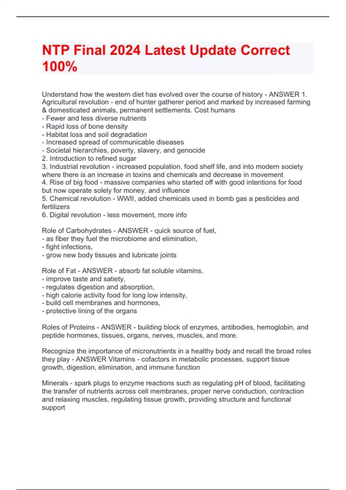 Understand how the western diet has evolved over the course of history - ANSWER 1. Agricultural revolution - end of hunter gatherer period and marked by increased farming & domesticated animals, permanent settlements. Cost humans - Fewer and less diverse nutrients - Rapid loss of bone density - Habitat loss and soil degradation - Increased spread of communicable diseases - Societal hierarchies, poverty, slavery, and genocide 2. Introduction to refined sugar 3. Industrial revolution - increased population, food shelf life, and into modern society where there is an increase in toxins and chemicals and decrease in movement 4. Rise of big food - massive companies who started off with good intentions for food but now operate solely for money, and influence 5. Chemical revolution - WWII, added chemicals used in bomb gas a pesticides and fertilizers 6. Digital revolution - less movement, more info Role of Carbohydrates - ANSWER - quick source of fuel, - as fiber they fuel the microbiome and elimination, - fight infections, - grow new body tissues and lubricate joints Role of Fat - ANSWER - absorb fat soluble vitamins, - improve taste and satiety, - regulates digestion and absorption, - high calorie activity food for long low intensity, - build cell membranes and hormones, - protective lining of the organs Roles of Proteins - ANSWER - building block of enzymes, antibodies, hemoglobin, and peptide hormones, tissues, organs, nerves, muscles, and more. Recognize the importance of micronutrients in a healthy body and recall the broad roles they play - ANSWER Vitamins - cofactors in metabolic processes, support tissue growth, digestion, elimination, and immune function Minerals - spark plugs to enzyme reactions such as regulating pH of blood, facilitating the transfer of nutrients across cell membranes, proper nerve conduction, contraction and relaxing muscles, regulating tissue growth, providing structure