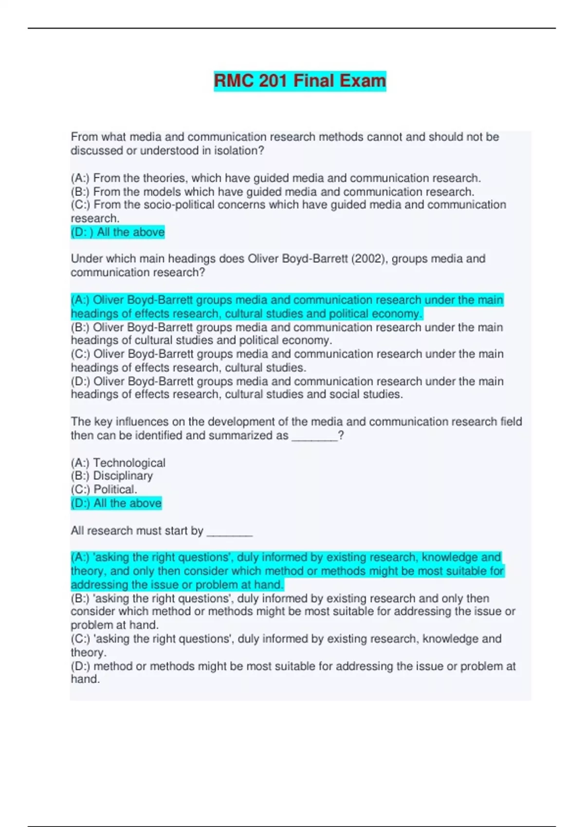RMC 201 Final Exam | Q & A (Complete Solutions) From what media and communication research methods cannot and should not be discussed or understood in isolation? (A:) From the theories, which have guided media and communication research. (B:) From the models which have guided media and communication research. (C:) From the socio-political concerns which have guided media and communication research. (D: ) All the above Under which main headings does Oliver Boyd-Barrett (2002), groups media and communication research? (A:) Oliver Boyd-Barrett groups media and communication research under the main headings of effects research, cultural studies and political economy. (B:) Oliver Boyd-Barrett groups media and communication research under the main headings of cultural studies and political economy. (C:) Oliver Boyd-Barrett groups media and communication research under the main headings of effects research, cultural studies. (D:) Oliver Boyd-Barrett groups media and communication research under the main headings of effects research, cultural studies and social studies. The key influences on the development of the media and communication research field then can be identified and summarized as _______? (A:) Technological (B:) Disciplinary (C:) Political. (D:) All the above All research must start by _______ (A:) 'asking the right questions', duly informed by existing research, knowledge and theory, and only then consider which method or methods might be most suitable for addressing the issue or problem at hand. (B:) 'asking the right questions', duly informed by existing research and only then consider which method or methods might be most suitable for addressing the issue or problem at hand. (C:) 'asking the right questions', duly informed by existing research, knowledge and theory. (D:) method or methods might be most suitable for addressing the issue or problem at hand. Never should research start by choosing a method before considering _______ (A:) what frameworks to draw on (B:) what research questions to ask and what theoretical frameworks to draw on. (C:) what research questions to ask and what frameworks to draw on. (D:) what research questions to ask. Research is not principally about gathering _______that lends itself to easy collection or analysis, but rather about using/choosing the right methodological tools for addressing 'relevant' questions. (A:) Analysis. (B:) Questions. (C:) data. (D: ) collection (C:) data. How is the opinion of Murdock on the research questions addressed by media and communication research? (A:) Murdock is clear that the research questions addressed by media and communication research must be anchored by their social relevance and historical awareness, and must deal in a social scientific and critical way with questions of power, structure and change in society. (B:) Murdock is clear that the research questions addressed by media and communication research must be anchored by their historical awareness, and must deal in a social scientific and critical way with questions of power, structure and change in society. (C:) Murdock is clear that the research questions addressed by media and communication research must be anchored by their social relevance and historical awareness, and must deal in a social scientific and critical way with questions of power in society. (D: ) Murdock is clear that the research questions addressed by media and communication research must be anchored by their social relevance and historical awareness. Which considerations of relevance of research? (A:) Considerations about the social, political and policy relevance of research. (B:) Considerations about the political relevance of research. (C:) Considerations about the social relevance of research. (D: ) Considerations about the policy relevance of research. What is scholarly research? (A:) Scholarly research is something that people undertake in order to find out things in a systematic way, thereby increasing their knowledge. (B:) Looking for information about something. (C:) Scholarly research is something that people undertake in order to find out things to increase their knowledge. (D: ) Scholarly research is theory based. What is the difference between scholarly and everyday research? (A:) Scholarly research is more systematic, more objective, more careful, and more concerned about correctness and truthfulness than everyday research. (B:) Historians focus on economic, political and social considerations. (C:) Scholarly research is finding out things. (D: ) Scholarly research is theory based. What role do binary oppositions play in the way the mind works? (A:) The human mind, de Saussure (1915/1966) argued, makes sense of the world essentially by forming binary oppositions that establish relationships in various areas, and it is through relationships that we find meaning. (B:) An important role. (C:) A meaning role. (D: ) For comparison. What are the five aspects of communication? (A:) 1. Intrapersonal 2. Interpersonal 3. Small group 4. Organizational 5. Mass media. (B:) 1. Intrapersonal 2. Interaction 3. Small group 4. Organizational 5. Mass media (C:) 1. Intrapersonal 2. Interpersonal 3. Small group 4. Other interested parties 5. Mass media (D: ) 1. Intrapersonal 2. Interpersonal 3. Small group 4. Organizational 5. Television Define media and communication research then as the planned, critical, systematic and transparent investigation into or gathering of _______ about media and/or communication processes. (A:) Icon. (B:) Information. (C:) Interface. (D: ) Interactive. What is relevant - even at this early point - to consider for all researchers? (A:) how a potential topic relates to 'media and communications', why it is interesting to research, etc. (B:) whether it has been researched before (i.e. what other research has addressed this or similar topics), whether the relevant data/information can be accessed and collected, etc. (C:) whether you (the researcher) have the skills 
