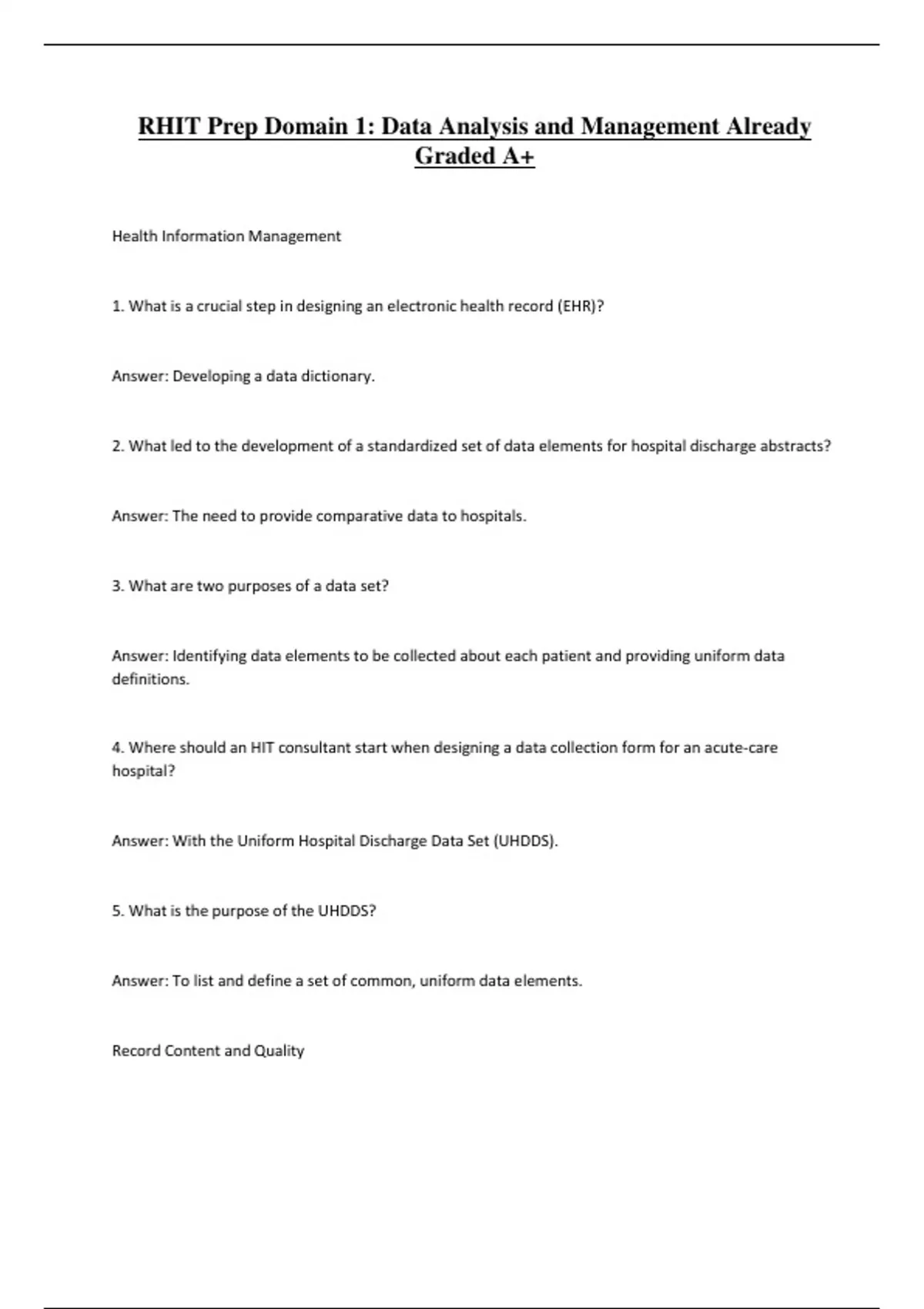 RHIT Prep Domain 1: Data Analysis and Management Already Graded A+ Health Information Management 1. What is a crucial step in designing an electronic health record (EHR)? Answer: Developing a data dictionary. 2. What led to the development of a standardized set of data elements for hospital discharge abstracts? Answer: The need to provide comparative data to hospitals. 3. What are two purposes of a data set? Answer: Identifying data elements to be collected about each patient and providing uniform data definitions. 4. Where should an HIT consultant start when designing a data collection form for an acute-care hospital? Answer: With the Uniform Hospital Discharge Data Set (UHDDS). 5. What is the purpose of the UHDDS? Answer: To list and define a set of common, uniform data elements. Record Content and Quality 6. What is the process called when deficiencies in health records are identified through analysis? Answer: Identifying incomplete records. 7. In a paper-based system, where are incomplete records monitored? Answer: In the incomplete file room. 8. What is the goal of completing a chart in a special area of the HIM department? Answer: To ensure completeness. Authentication and Documentation 9. What is authentication in a record? Answer: Establishing its baseline trustworthiness. 10. How can coding managers address documentation issues with physicians failing to document cause and effect of diabetes and its manifestations? Answer: Educating medical staff on their roles in clinical documentation improvement and providing documentation guidelines. Assessment ️A(n) _____ entry in a SOAP note relates professional conclusions reached from evaluation of the other information gathered during the encounter. Ex: "Blood pressure adequately controlled." Plan ️A(n) _____ entry in an a SOAP note relates diagnostic, therapeutic, and educational plans to resolve the problem. SNOMED: Systemized Nomenclature of Medicine Clinical Terminology ️a comprehensive clinical vocabulary designed to encompass all the terms used in medicine, including procedures and diagnoses. provides the most comprehensive controlled vocabulary for coding the content of a pt record which facilitates the development of computer-based pt records. ICD-9-CM ️Provides a system for classifying morbidity and mortality information for statistical purposes. Data, Information ️_____ represents basic facts, while _____ represents meaning. Structure and content ️Information standards that provide clear descriptors of data elements to be included in computer-based pt record systems are called _____ standards. data currency / timeliness ️_____ means that healthcare data should be up-to-date and recorded at or near the time of the event or observation. data consistency ️_____ means that the data is reliable. Reliable data do not change no matter how many times or in how many ways they are stored, processed or displayed.