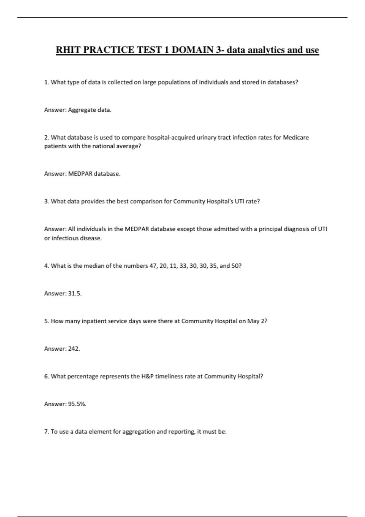 RHIT PRACTICE TEST 1 DOMAIN 3- data analytics and use 1. What type of data is collected on large populations of individuals and stored in databases? Answer: Aggregate data. 2. What database is used to compare hospital-acquired urinary tract infection rates for Medicare patients with the national average? Answer: MEDPAR database. 3. What data provides the best comparison for Community Hospital's UTI rate? Answer: All individuals in the MEDPAR database except those admitted with a principal diagnosis of UTI or infectious disease. 4. What is the median of the numbers 47, 20, 11, 33, 30, 30, 35, and 50? Answer: 31.5. 5. How many inpatient service days were there at Community Hospital on May 2? Answer: 242. 6. What percentage represents the H&P timeliness rate at Community Hospital? Answer: 95.5%. 7. To use a data element for aggregation and reporting, it must be: Answer: Abstracted and indexed. 8. What is the definition of a primary key in a database table? Answer: A unique identifier that uniquely identifies each row in a table. 9. What should be done if a hospital's quality goal is not met, as shown by audit data? Answer: Determine whether there was a medical or other reason why patients were not given aspirin. 10. What type of organization does David work for, using health record data to prove or disprove treatment efficacy? Answer: Research organization. 11. How does an internal user utilize secondary data? Answer: By benchmarking with other facilities. 12. What is the next step in data acquisition after determining the types of cases to be included in a registry? Answer: Case abstracting. 13. Why is HCUP advantageous for research purposes? Answer: It contains data on all payer types. 14. What type of activity would you monitor when reviewing audit trails of access to patient information? Answer: Every access to every data element or document type, whether the person viewed, created, updated, or deleted the information, and physical location on the network where the access occurred. 15. What is the first step in analyzing data? Answer: Know your objectives or purpose of the data analysis. 16. When a distribution is skewed, what happens to the mean? Answer: It gravitates in the direction of the extreme values, making a long tail when a distribution is skewed to the right side, which is called a positively skewed distribution.