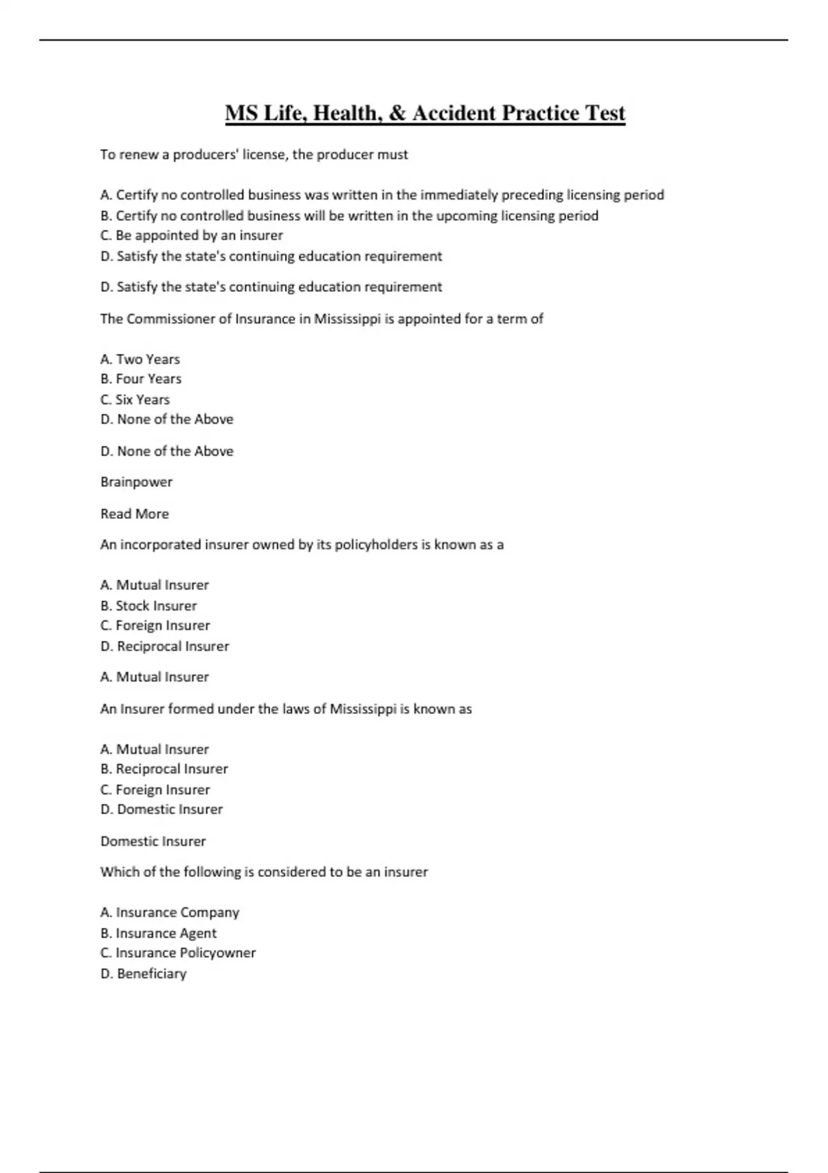 The Commissioner of Insurance in Mississippi is appointed for a term of