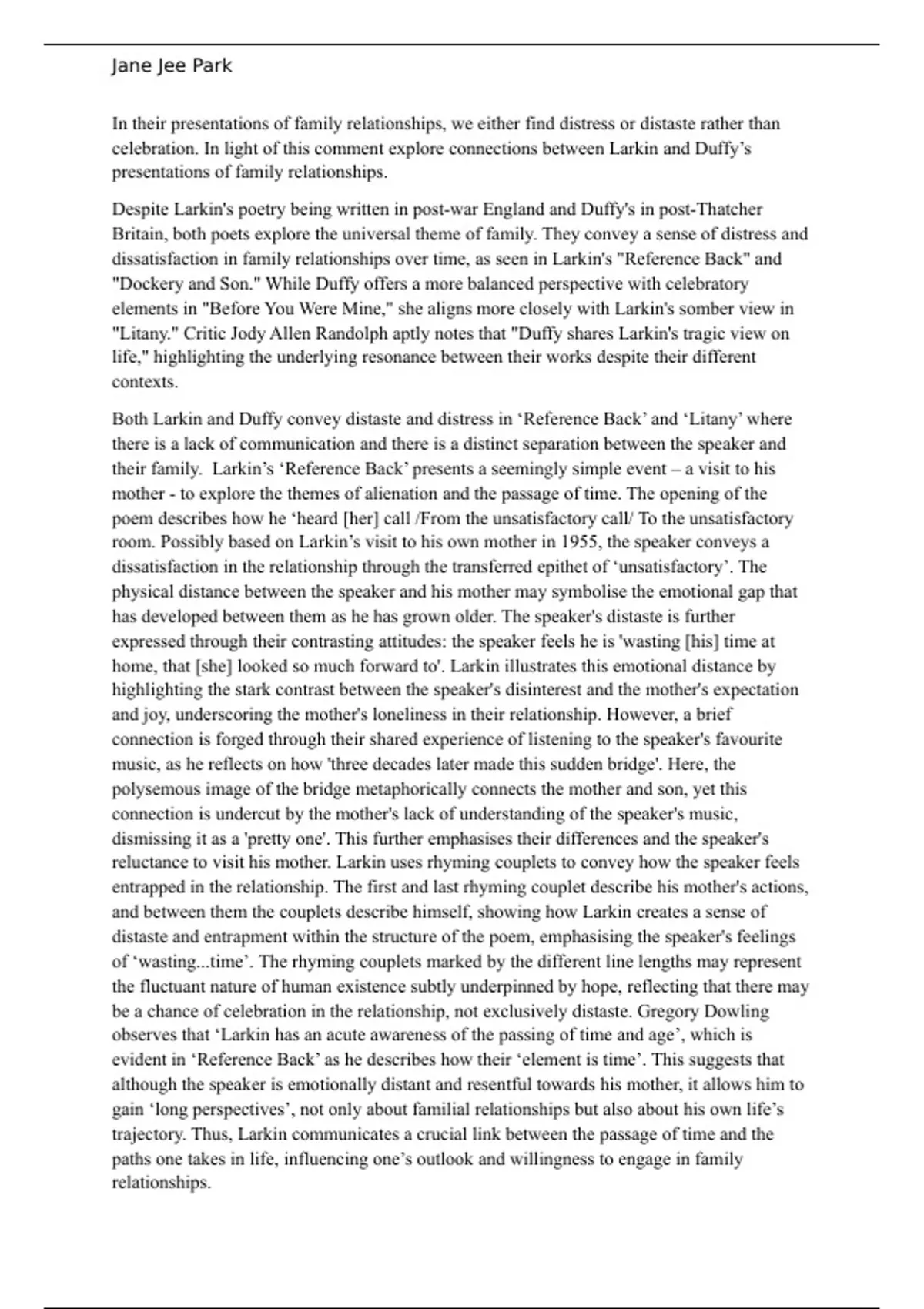 Mark: 57/60 An A star essay comparing Larkin and Duffy’s poetry from their collections The Whitsun Weddings and Mean Time on the topic of whether distress is found rather than celebration in family relationships. Exploring connections between their presentations. Careful and thorough analysis. Poems used are: Dockery and Son and Reference Back for Larkin and Litany and Before you were mine for Duffy.