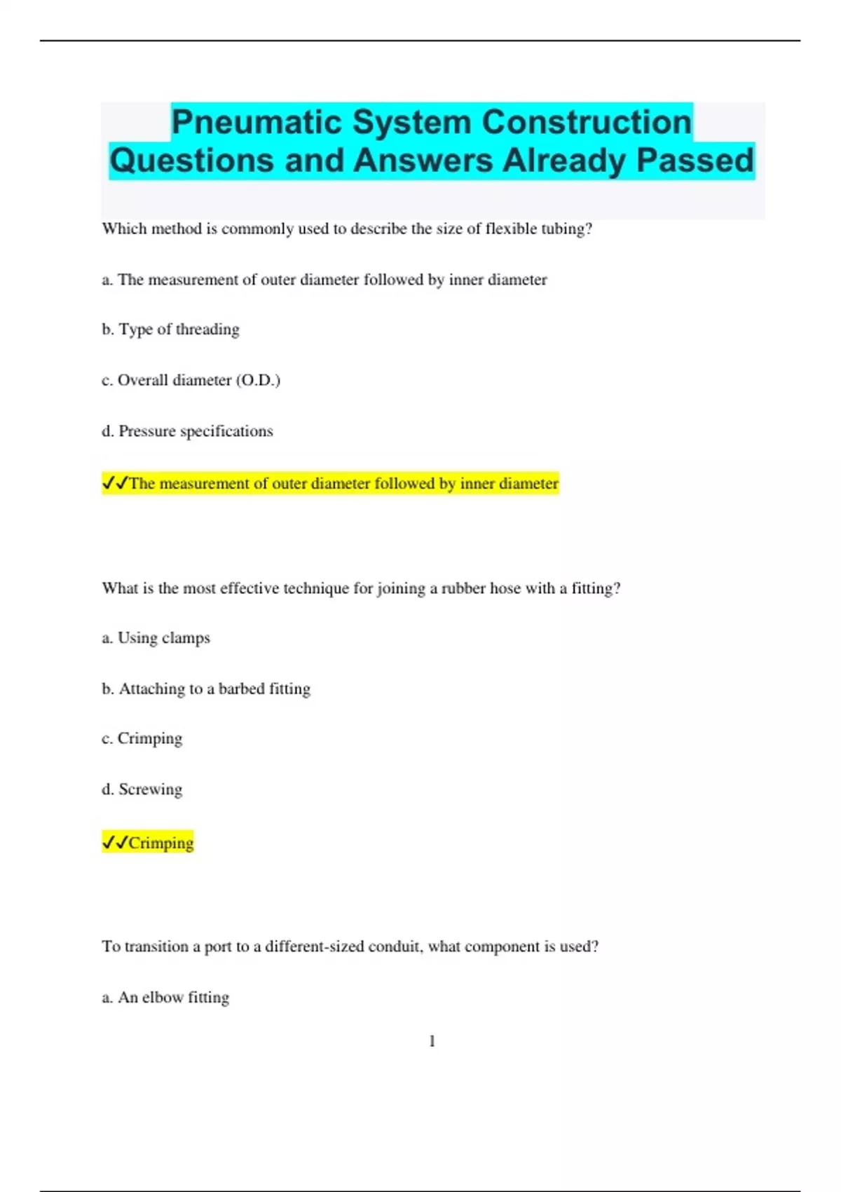 Pneumatic System Construction Questions and Answers Already Passed Which method is commonly used to describe the size of flexible tubing? a. The measurement of outer diameter followed by inner diameter b. Type of threading c. Overall diameter (O.D.) d. Pressure specifications The measurement of outer diameter followed by inner diameter What is the most effective technique for joining a rubber hose with a fitting? a. Using clamps b. Attaching to a barbed fitting c. Crimping d. Screwing Crimping To transition a port to a different-sized conduit, what component is used? a. An elbow fitting 2 b. A bulkhead fitting c. A connector d. An adapter An adapter Which semi-flexible material is typically chosen for supply lines in pneumatic systems? a. Polyethylene b. Polyurethane ether c. Hard nylon d. Polyurethane Hard nylon What ensures a pressure-tight seal in straight thread fittings? a. Thread deformation b. A sealing gasket c. Teflon tape d. A bushing A sealing gasket 3 How are pipe threads characterized? a. They are fine-threaded b. They are sized by their actual outside diameter c. They are straight