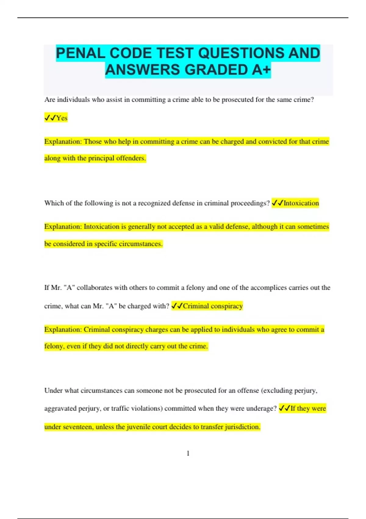 PENAL CODE TEST QUESTIONS AND ANSWERS GRADED A+ Are individuals who assist in committing a crime able to be prosecuted for the same crime? Yes Explanation: Those who help in committing a crime can be charged and convicted for that crime along with the principal offenders. Which of the following is not a recognized defense in criminal proceedings? Intoxication Explanation: Intoxication is generally not accepted as a valid defense, although it can sometimes be considered in specific circumstances. If Mr. "A" collaborates with others to commit a felony and one of the accomplices carries out the crime, what can Mr. "A" be charged with? Criminal conspiracy Explanation: Criminal conspiracy charges can be applied to individuals who agree to commit a felony, even if they did not directly carry out the crime. Under what circumstances can someone not be prosecuted for an offense (excluding perjury, aggravated perjury, or traffic violations) committed when they were underage? If they were under seventeen, unless the juvenile court decides to transfer jurisdiction. 2 Explanation: Juveniles under the age of seventeen are generally not prosecuted as adults, unless a court decides otherwise. What are the potential consequences for a third-degree felony conviction? Imprisonment in the Texas Department of Criminal Justice for between two and ten years, and a fine up to $10,000. Explanation: A third-degree felony can result in a prison term ranging from two to ten years and a fine of up to $10,000. Which of the following is not required to prove the crime of murder? Causing the death of a person while under the influence of alcohol Explanation: While alcohol consumption may affect the case, proving murder does not specifically require demonstrating that the perpetrator was intoxicated. What offense is committed if someone kidnaps another person intending to obstruct governmental functions? Aggravated kidnapping Explanation: Aggravated kidnapping involves abducting someone to interfere with government operations or other severe intentions. What is it called when someone engages in sexual activity in a public place? Public lewdness 3 Explanation: Public lewdness refers to engaging
