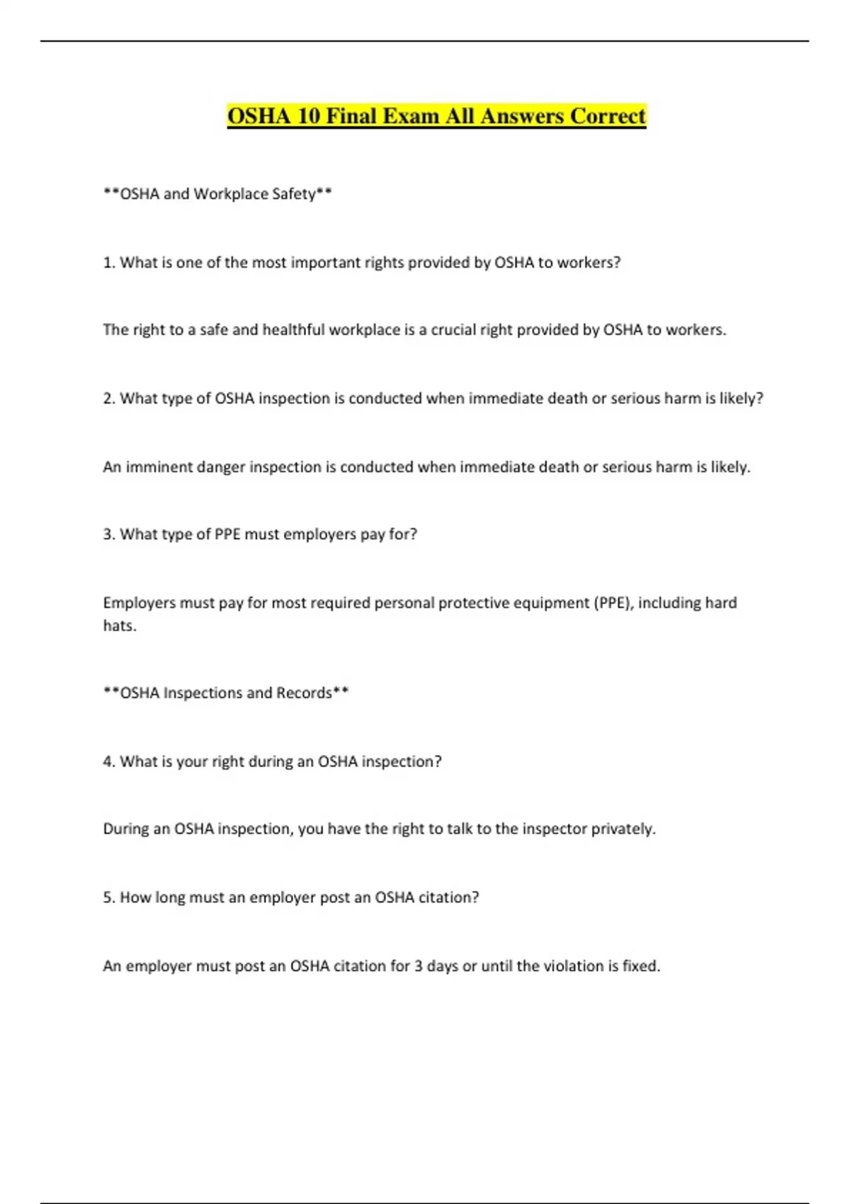 OSHA 10 Final Exam All Answers Correct **OSHA and Workplace Safety** 1. What is one of the most important rights provided by OSHA to workers? The right to a safe and healthful workplace is a crucial right provided by OSHA to workers. 2. What type of OSHA inspection is conducted when immediate death or serious harm is likely? An imminent danger inspection is conducted when immediate death or serious harm is likely. 3. What type of PPE must employers pay for? Employers must pay for most required personal protective equipment (PPE), including hard hats. **OSHA Inspections and Records** 4. What is your right during an OSHA inspection? During an OSHA inspection, you have the right to talk to the inspector privately. 5. How long must an employer post an OSHA citation? An employer must post an OSHA citation for 3 days or until the violation is fixed. 6. What section of the OSH Act outlines the right of workers to seek safety and health on the job without fear of punishment? Section 11(c) of the OSH Act spells out the right of workers to seek safety and health on the job without fear of punishment. 7. What are some rights related to OSHA recordkeeping? Workers have the right to review the OSHA 300 Log and the OSHA 300 Summary. **OSHA Mission and Responsibilities** 8. What is OSHA's mission? OSHA's mission is to protect the safety and health of America's workers. 9. What is one of the main responsibilities employers have under OSHA? One of the main responsibilities employers have under OSHA is to provide training required by OSHA standards. **Hazardous Materials and Fall Protection** 10. What does a Material Safety Data Sheet (MSDS) provide information about? A Material Safety Data Sheet (MSDS) provides information about hazardous chemicals. 11. How can you request an OSHA inspection if you feel that hazards need to be corrected at your workplace? You can submit a written, signed complaint with specific hazard information if you feel that an OSHA inspection is needed. 12. What are some ways employers can protect workers from falls? Employers can protect workers from falls using guardrails, safety net systems, and personal fall arrest systems. **Fall Protection** 13. When must fall protection be provided to workers on scaffolds? Fall protection must be provided to workers on scaffolds if they are working more than 10 feet above a lower level. 14. How often must personal fall arrest systems be inspected for damage?