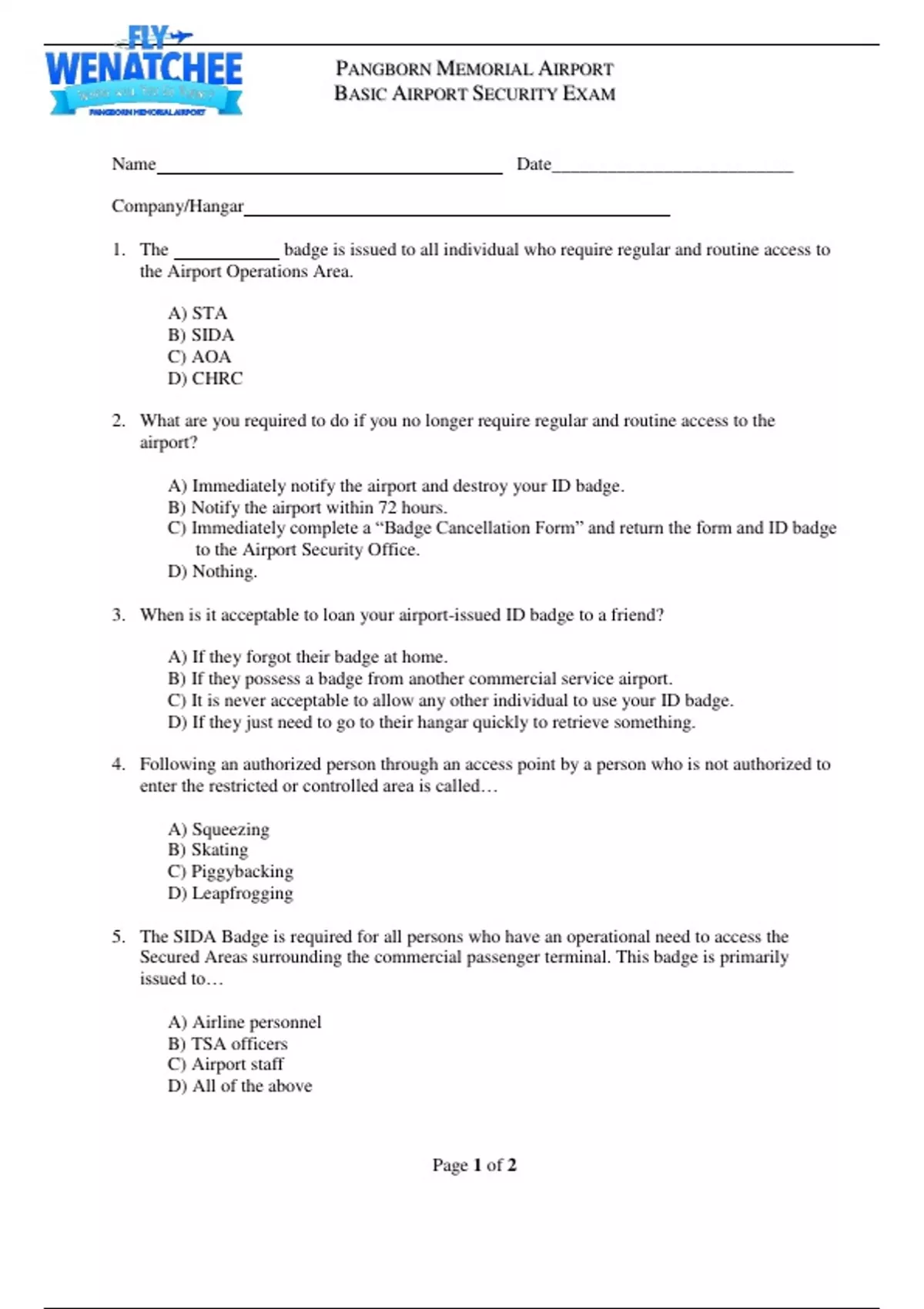 PANGBORN MEMORIAL AIRPORT BASIC AIRPORT SECURITY EXAM