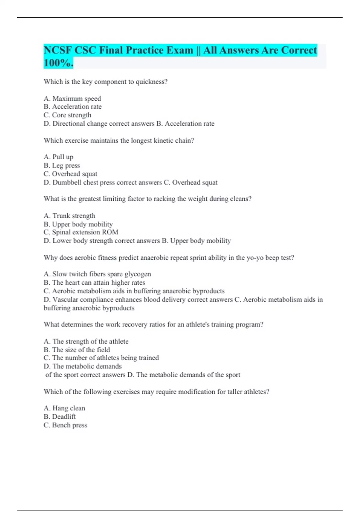 Which is the key component to quickness? A. Maximum speed B. Acceleration rate C. Core strength D. Directional change correct answers B. Acceleration rate Which exercise maintains the longest kinetic chain? A. Pull up B. Leg press C. Overhead squat D. Dumbbell chest press correct answers C. Overhead squat What is the greatest limiting factor to racking the weight during cleans? A. Trunk strength B. Upper body mobility C. Spinal extension ROM D. Lower body strength correct answers B. Upper body mobility Why does aerobic fitness predict anaerobic repeat sprint ability in the yo-yo beep test? A. Slow twitch fibers spare glycogen B. The heart can attain higher rates C. Aerobic metabolism aids in buffering anaerobic byproducts D. Vascular compliance enhances blood delivery correct answers C. Aerobic metabolism aids in buffering anaerobic byproducts What determines the work recovery ratios for an athlete's training program? A. The strength of the athlete B. The size of the field C. The number of athletes being trained D. The metabolic demands of the sport correct answers D. The metabolic demands of the sport Which of the following exercises may require modification for taller athletes? A. Hang clean B. Deadlift C. Bench press