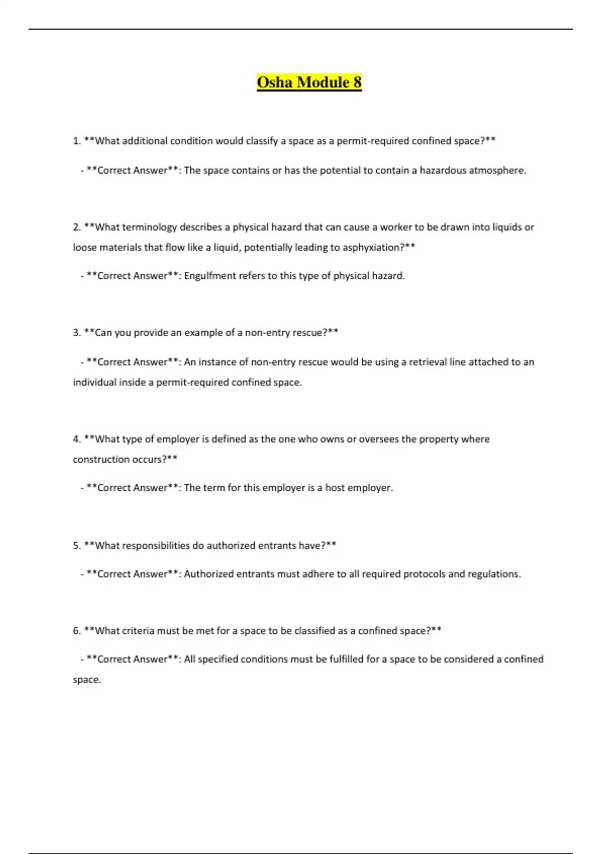 Osha Module 8 1. **What additional condition would classify a space as a permit-required confined space?** - **Correct Answer**: The space contains or has the potential to contain a hazardous atmosphere. 2. **What terminology describes a physical hazard that can cause a worker to be drawn into liquids or loose materials that flow like a liquid, potentially leading to asphyxiation?** - **Correct Answer**: Engulfment refers to this type of physical hazard. 3. **Can you provide an example of a non-entry rescue?** - **Correct Answer**: An instance of non-entry rescue would be using a retrieval line attached to an individual inside a permit-required confined space. 4. **What type of employer is defined as the one who owns or oversees the property where construction occurs?** - **Correct Answer**: The term for this employer is a host employer. 5. **What responsibilities do authorized entrants have?** - **Correct Answer**: Authorized entrants must adhere to all required protocols and regulations. 6. **What criteria must be met for a space to be classified as a confined space?** - **Correct Answer**: All specified conditions must be fulfilled for a space to be considered a confined space. 7. **Who is tasked with keeping an accurate tally of authorized entrants within a permit-required space?** - **Correct Answer**: The attendant is responsible for maintaining this count.