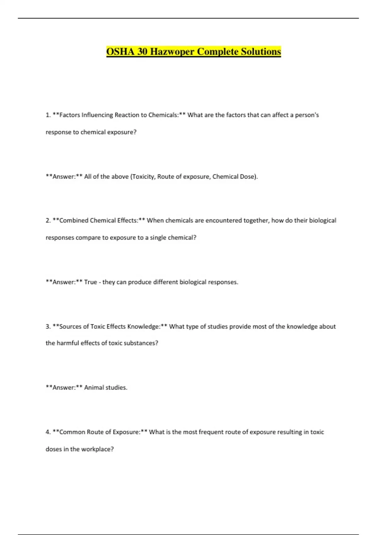 OSHA 30 Hazwoper Complete Solutions 1. **Factors Influencing Reaction to Chemicals:** What are the factors that can affect a person's response to chemical exposure? **Answer:** All of the above (Toxicity, Route of exposure, Chemical Dose). 2. **Combined Chemical Effects:** When chemicals are encountered together, how do their biological responses compare to exposure to a single chemical? **Answer:** True - they can produce different biological responses. 3. **Sources of Toxic Effects Knowledge:** What type of studies provide most of the knowledge about the harmful effects of toxic substances? **Answer:** Animal studies. 4. **Common Route of Exposure:** What is the most frequent route of exposure resulting in toxic doses in the workplace? **Answer:** Inhalation. 5. **OSHA Standards Sources:** Which of the following is not a source for OSHA standards? **Answer:** Work standards developed by the individual company. 6. **Hazardous Waste Legislation Timeline:** When did legislation concerning hazardous waste first begin to take effect? **Answer:** 1970s. 7. **Employer Responsibilities:** Which of the following is not considered an employer responsibility? **Answer:** Follow SOPs and wear required PPE. 8. **Employee Responsibilities:** While employers have duties related to hazard elimination and compliance, who must follow SOPs and use PPE when necessary on the job? **Answer:** The employee. 9. **Federal Agency Rules Documentation:** What compiles the general and permanent rules of federal agencies? **Answer:** The Code of Federal Regulations. 10. **Regulation of Hazardous Waste Operations:** Which section of OSHA pertains to Hazardous Waste Operations and Emergency Response? **Answer:** 29 CFR 1910.120. 11. **Coverage Under Hazardous Waste Regulations:** Who is not included under the Hazardous Waste Operations and Emergency Response section of OSHA? **Answer:** A family who is exposed to hazardous waste buried under their house. 12. **HazCom Program Availability:** Is it true that the Hazard Communication (HazCom) program must be documented and accessible to employees? **Answer:** True. 13. **Key Components of HazCom Program:** What elements should be included in the HazCom program? **Answer:** - Conduct a chemical inventory. - Obtain and maintain an SDS for each chemical. - Provide a written document detailing the hazard communication program to all employees. - Label all chemical containers and educate staff on the associated hazards. - Train employees on the dangers and appropriate use of chemicals. Which of the following is an employee right? - Be informed of your rights and responsibilities - Cooperate with OSHA - Follow SOPs and wear required PPE - Post OSHA poster in a prominent place Be informed of your rights and responsibilities The Hazard Communication Standard: - Is a broad general guideline suggesting how companies should handle chemicals - Was created in response to the need to protect workers from chemicals in the workplace - Requires employers to evaluate chemical hazards in their facilities and to communicate the hazard information to employees - B and C B and C Which one of these statements is NOT true? - OSHA stands for the Occupational Safety and Health Administration - The OSH Act resulted in the creation of the Safety and Health Administration, or OSHA - Employers take all responsibility under the OSH Act - OSHA went into effect in 1971 Employers take all responsibility under the OSH Act Ceiling refers to which of the following: - The level at which a personal protective equipment plan must be implemented - The level that can never be exceeded during any part of the working exposure without protective actions - The level at which exposures should not be exceed a period of 15 minutes