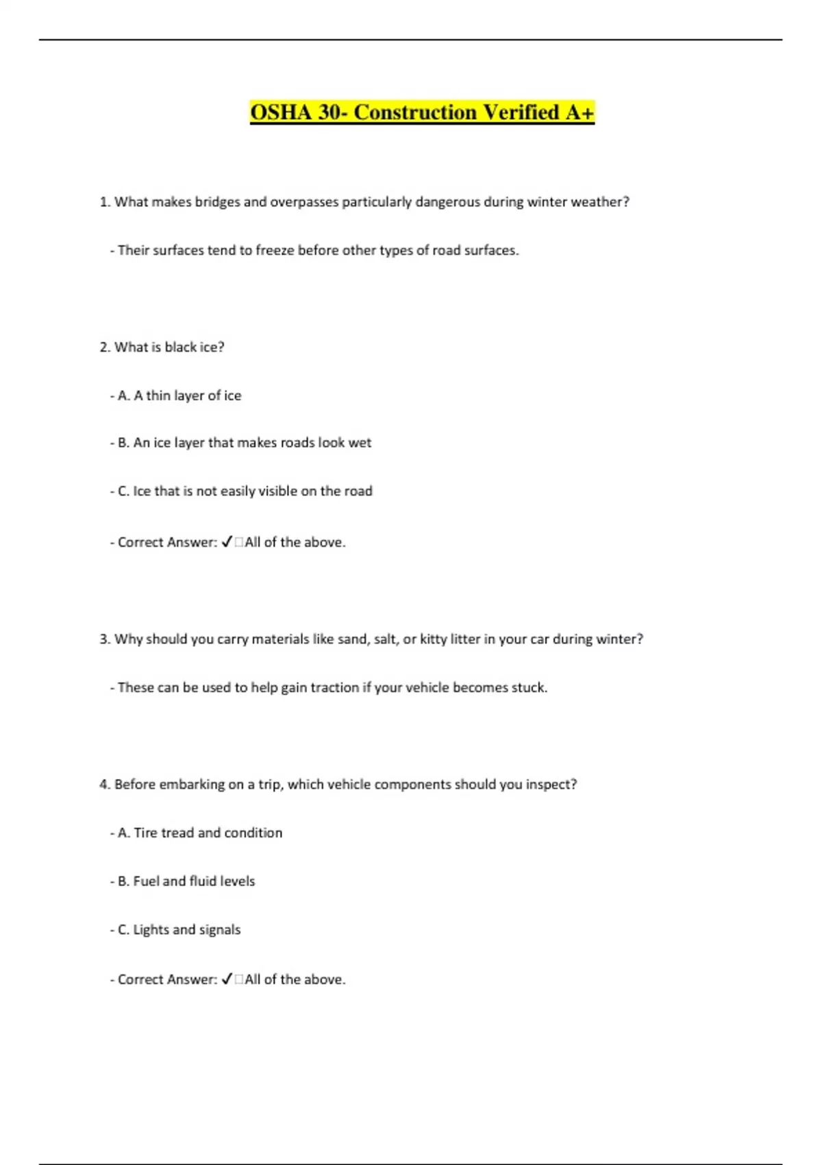 OSHA 30- Construction Verified A+ 1. What makes bridges and overpasses particularly dangerous during winter weather? - Their surfaces tend to freeze before other types of road surfaces. 2. What is black ice? - A. A thin layer of ice - B. An ice layer that makes roads look wet - C. Ice that is not easily visible on the road - Correct Answer: ️All of the above. 3. Why should you carry materials like sand, salt, or kitty litter in your car during winter? - These can be used to help gain traction if your vehicle becomes stuck. 4. Before embarking on a trip, which vehicle components should you inspect? - A. Tire tread and condition - B. Fuel and fluid levels - C. Lights and signals - Correct Answer: ️All of the above. 5. To maintain traction while driving in winter conditions, what is the first necessary action? - Confirm that your tires have sufficient tread. 6. Is it advisable to drive in the tire tracks of other vehicles on snow-covered highways? - ️False. 7. Which strategy will help prevent skidding on slick road surfaces? - Manage your speed. 8. If your vehicle gets stuck in snow, which of the following methods might help you get free? - Utilizing your floor mats to create traction under your tires. 9. In case you find yourself snowbound, how can you signal for help? - A. A brightly colored cloth tied to your antenna or at the top of a rolled-up window - B. Road flares - C. Reflective triangles - Correct Answer: ️All of the above. 10. What should you do if you become snowbound? - ️Stay with your vehicle. 11. True or False: The use of asbestos was completely phased out by 1980 regarding products that could be human health hazards. - ️False. 12. Which of the following still has current applications for asbestos? - A. Automobile clutches - B. Brake pads - C. Vinyl tile - D. Fireproofing - E. Industrial applications - Correct Answer: ️All of the above. 13. Which building material is most likely to release asbestos fibers?