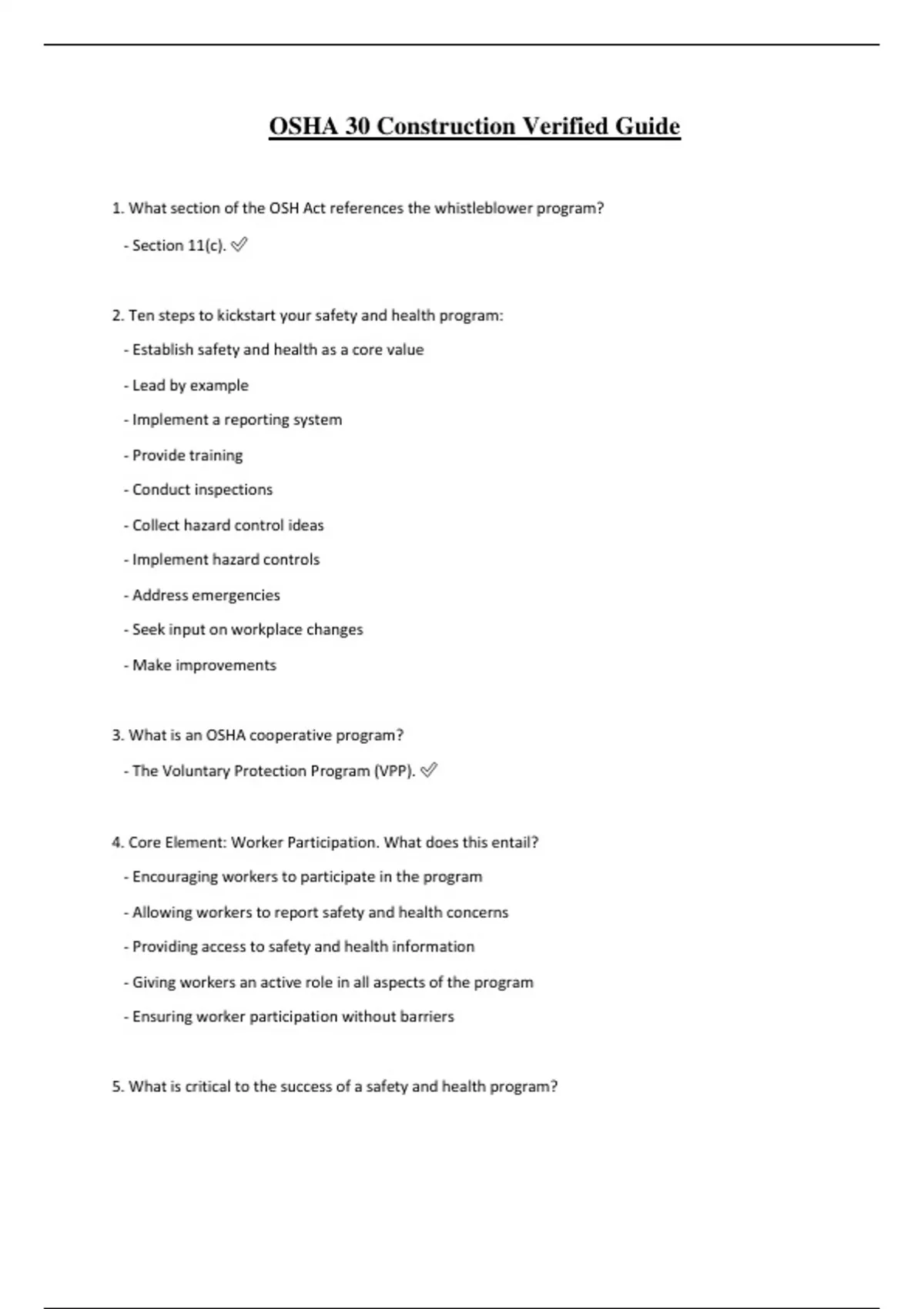 OSHA 30 Construction Verified Guide 1. What section of the OSH Act references the whistleblower program? - Section 11(c). 2. Ten steps to kickstart your safety and health program: - Establish safety and health as a core value - Lead by example - Implement a reporting system - Provide training - Conduct inspections - Collect hazard control ideas - Implement hazard controls - Address emergencies - Seek input on workplace changes - Make improvements 3. What is an OSHA cooperative program? - The Voluntary Protection Program (VPP). 4. Core Element: Worker Participation. What does this entail? - Encouraging workers to participate in the program - Allowing workers to report safety and health concerns - Providing access to safety and health information - Giving workers an active role in all aspects of the program - Ensuring worker participation without barriers 5. What is critical to the success of a safety and health program? - Worker participation in the program development. 6. Core Element: Workplace hazards. What procedures should be included? - Collecting existing information about workplace hazards - Inspecting the workplace for safety hazards - Identifying health hazards - Conducting incident investigations - Identifying hazards associated with emergency and non-routine situations - Characterizing the nature of identified hazards, identifying interim control measures, and prioritizing hazards for control 7. When should a hazard assessment be conducted? - Whenever a new substance, process, procedure, or equipment is introduced to the workplace; whenever new or previously unrecognized hazards are uncovered; or whenever a safety and health program is first established. 8. What does JHA stand for? - Job Hazard Analysis. 9. What is JHA used for? - Identifying needed safety and health training programs. 10. Hazard Prevention and Control. Investigation Process: What steps are involved? 1. Visiting the accident scene as soon as possible 2. Interviewing injured workers and witnesses 3. Examining the workplace 4. Determining the cause or causes 5. Taking corrective action 6. Recording the findings and corrective actions Three major components of a personal fall arrest system: ️Anchor and the anchorage connector, full body harness, and connecting device (lanyard or retractable lifeline, with snap hooks) Personal fall arrest snap-hooks must be locking and be: ️Designed to prevent opening and slipping off the connector Three main types of portable ladders ️Step, straight, extension a _______________________ must be available to direct workers who are constructing or moving scaffolds. ️Competent Person Osha defines a competent person as ️"one who is capable of identifying existing and predictable hazards in the surroundings or working conditions which are unsanitary, hazardous, or dangerous to workers, and who has authorization to take prompt corrective measures to eliminate them." Electrical Hazards 6 ️BESAFE Burns Electrocution Shock Arc flash Fire Explosions The sudden release of electrical energy through the air when a high-voltage gap exists between conductors is referred to as an: ️Arc flash According to OSHA, what does the term "electrocution" mean? ️Death caused by exposure to electricity The three most common types of GFCI's used today are ️Receptacle, Portable, Circuit Breaker 5 Major Causes of Lockout/Tagout Injuries (Electrical) ️1. Accidental restarting of equipment (50%) 2. Failure to release residual energy (25%) 3. Failure to disconnect from power source (10%) 4. Failure to clear work areas before restarting (10%) 5. Failure to stop equipment (5%) Fuses and circuit breakers are intended primarily for the: ️Protection of conductors and equipment What should not be used to support a scaffold because they could collapse, sending the structure to the ground? ️Cinder blocks Trench protective systems include ️Sloping, benching, shoring, trench box 4 Struck-by Hazards ️1. Struck by flying object 2. Struck by falling object 3. Struck by swinging object 4. Struck by rolling object Head protection must be: ️Resistant to penetration and be able to absorb the shock of a blow. A Bureau of Labor Statistics survey found that most workers who suffered impact head injuries were: ️Not wearing head protection Eye and face protection must be stamped _________________ to indicate PPE meets specif. for design, construc., test, and use of eye and face protection ️ANSI Z87i (or something close.. def ANSI) These are worn where there are sparks and molten metal splashes; they have elastic sides or quick release buckles for speedy removal: ️Foundry boots This material is sometimes used for the soles of non-slip footwear ️Neoprene Acute Exposure ️Is both immediate exposure and symptoms The most common form of crystalline silica is ️cristobalite GHS ️The Globally Harmonized System of Classification and Labeling of Chemicals HAV ️Hand arm vibration Most common form of crystalline silica? ️Quartz Stationary masonry saws ️wet method of dust control should be used PEL ️Permissible exposure limit HCS ️Hazard Communication Standard According to the respirable crystalline silica standard, employers must conduct recordkeeping in accordance with what other OSHA standard? ️Access to employee exposure and medical records standard. What is a key component of the housekeeping requirements in the respirable crystalline silica standard ️No dry brushing or sweeping of silica dust. Stairs should be installed between what degrees? ️30-50 degrees 10 Rules when using a ladder ️1. Inspect the ladder 2. Inspect the location of use 3. Select the right ladder for the job 4. Position the ladder correctly (4:1) 5. Face the ladder and use the 3 point rule 6. Secure the ladder to a rigid support (tie off close to upper support point as possible) 7. Do not carry materials or tools while ascending and descending 8. Do not extend body beyond rails (belly button inside rails) 9. Never 