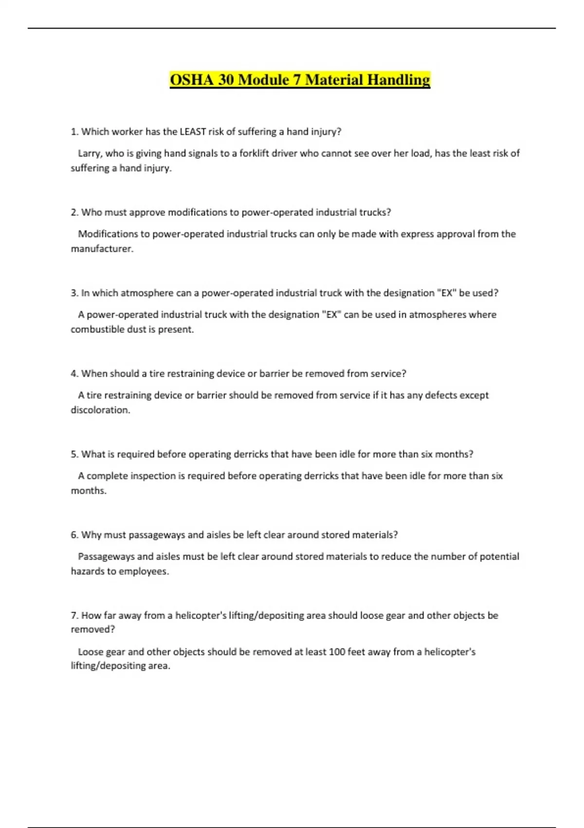 OSHA 30 Module 7 Material Handling 1. Which worker has the LEAST risk of suffering a hand injury? Larry, who is giving hand signals to a forklift driver who cannot see over her load, has the least risk of suffering a hand injury. 2. Who must approve modifications to power-operated industrial trucks? Modifications to power-operated industrial trucks can only be made with express approval from the manufacturer. 3. In which atmosphere can a power-operated industrial truck with the designation "EX" be used? A power-operated industrial truck with the designation "EX" can be used in atmospheres where combustible dust is present. 4. When should a tire restraining device or barrier be removed from service? A tire restraining device or barrier should be removed from service if it has any defects except discoloration. 5. What is required before operating derricks that have been idle for more than six months? A complete inspection is required before operating derricks that have been idle for more than six months. 6. Why must passageways and aisles be left clear around stored materials? Passageways and aisles must be left clear around stored materials to reduce the number of potential hazards to employees. 7. How far away from a helicopter's lifting/depositing area should loose gear and other objects be removed? Loose gear and other objects should be removed at least 100 feet away from a helicopter's lifting/depositing area. 8. When can multi-piece wheel components be interchanged? Multi-piece wheel components may only be interchanged if recommended by the rim manual. 9. Is "DP" a designation for industrial powered trucks? No, "DP" is not a designation for industrial powered trucks. 10. When should slings or wire ropes with broken wires in one strand in one lay be taken out of service? Slings or wire ropes with five or more broken wires in one strand in one lay should be taken out of service. 11. What is the minimum clearance between wires and any part of the crane or load when rated 50KV or below? The minimum clearance should be 10 feet. 12. What is the minimum clearance between wires and any part of the crane or load when in transit with no load and boom lowered? The minimum clearance should be 4 feet. 13. When should metal mesh slings be removed from service due to abrasion?