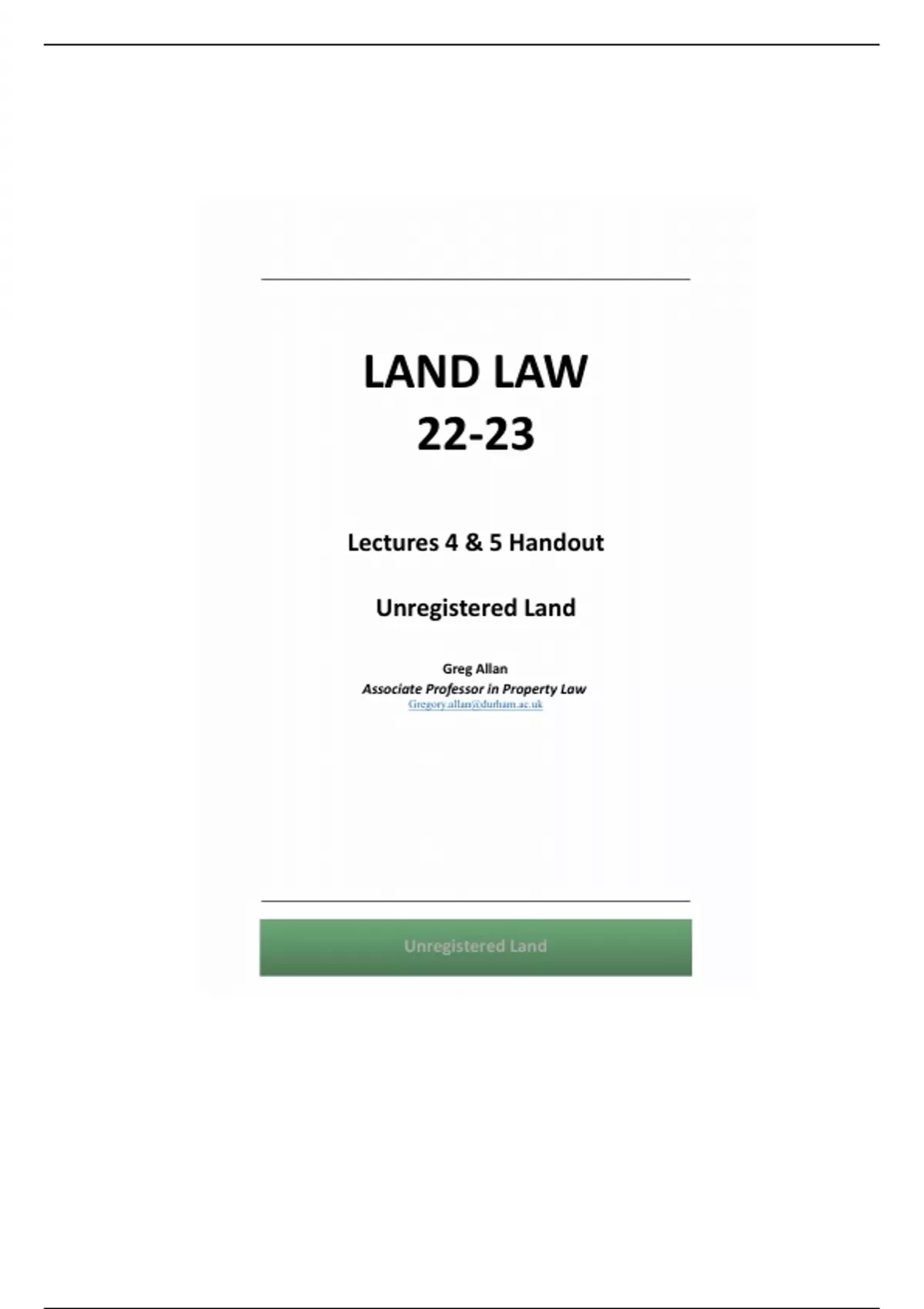 This is a comprehensive and detailed handout on Unregistered Land for Law 2011. Essential!! To your success in academics!!
