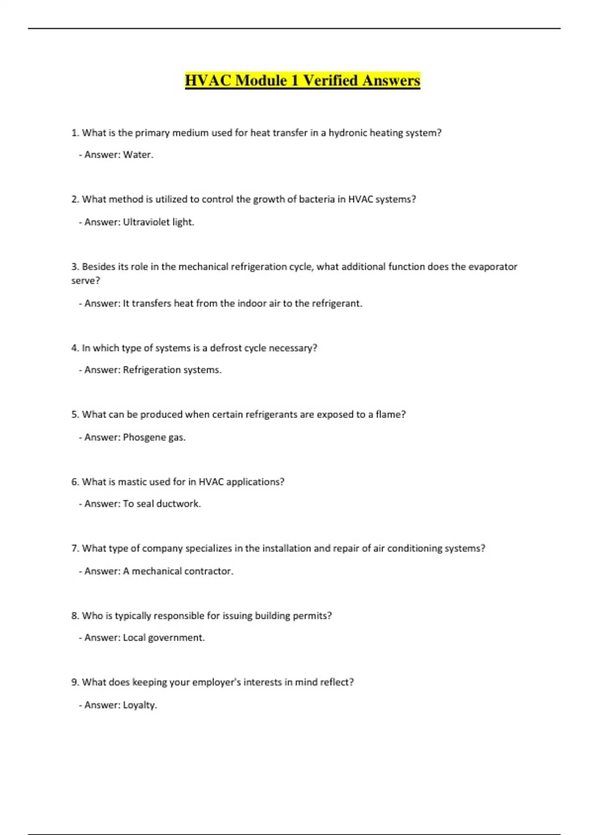 HVAC Module 1 Verified Answers 1. What is the primary medium used for heat transfer in a hydronic heating system? - Answer: Water. 2. What method is utilized to control the growth of bacteria in HVAC systems? - Answer: Ultraviolet light. 3. Besides its role in the mechanical refrigeration cycle, what additional function does the evaporator serve? - Answer: It transfers heat from the indoor air to the refrigerant. 4. In which type of systems is a defrost cycle necessary? - Answer: Refrigeration systems. 5. What can be produced when certain refrigerants are exposed to a flame? - Answer: Phosgene gas. 6. What is mastic used for in HVAC applications? - Answer: To seal ductwork. 7. What type of company specializes in the installation and repair of air conditioning systems? - Answer: A mechanical contractor. 8. Who is typically responsible for issuing building permits? - Answer: Local government. 9. What does keeping your employer's interests in mind reflect? - Answer: Loyalty. 10. What is the minimum number of classroom hours required annually for an apprentice program? - Answer: 144 hours. 11. Equipment manufacturers are most likely to employ individuals who provide what type of support? - Answer: Engineering assistance. 12. In a typical household forced-air furnace, from where is heat transferred to the heat exchangers? - Answer: Air. 13. What role does water play in heating systems? - Answer: It often serves as the heat exchange medium.
