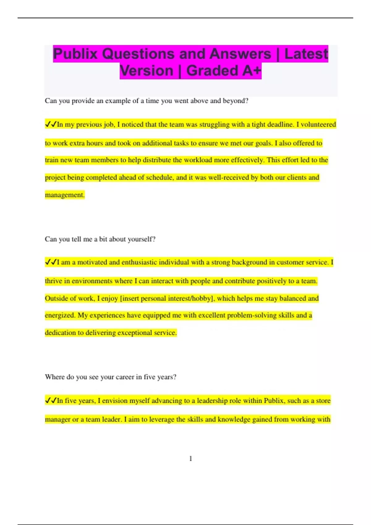 Publix Questions and Answers | Latest Version | Graded A+ Can you provide an example of a time you went above and beyond? In my previous job, I noticed that the team was struggling with a tight deadline. I volunteered to work extra hours and took on additional tasks to ensure we met our goals. I also offered to train new team members to help distribute the workload more effectively. This effort led to the project being completed ahead of schedule, and it was well-received by both our clients and management. Can you tell me a bit about yourself? I am a motivated and enthusiastic individual with a strong background in customer service. I thrive in environments where I can interact with people and contribute positively to a team. Outside of work, I enjoy [insert personal interest/hobby], which helps me stay balanced and energized. My experiences have equipped me with excellent problem-solving skills and a dedication to delivering exceptional service. Where do you see your career in five years? In five years, I envision myself advancing to a leadership role within Publix, such as a store manager or a team leader. I aim to leverage the skills and knowledge gained from working with 2 Publix to take on greater responsibilities and contribute to the company's success. I’m excited about the potential for professional growth and the opportunity to help guide and mentor others. Describe a time when you had to quickly learn something new. What was your approach? When I was promoted to a new role that required proficiency with a different software system, I took proactive steps to get up to speed quickly. I attended training sessions, reviewed online resources, and practiced using the software during downtime. Additionally, I reached out to colleagues who were experienced with the system for tips and guidance. This approach allowed me to become proficient in the new software and perform my job effectively. How do you manage stressful situations? I handle stress by staying organized and breaking down tasks into manageable steps. I prioritize my workload and use time management techniques to stay focused. When faced with high-pressure situations, I remain calm, take deep breaths, and address each challenge methodically. Additionally, I find it helpful to communicate openly with my team to ensure we are all aligned and can support each other. What is your greatest strength? I consider my greatest strength to be my ability to connect with people and provide excellent customer service. I enjoy interacting with customers and colleagues, and I am skilled at starting 3 conversations and building rapport. This strength helps me contribute positively to team dynamics and ensures that customers have a great experience. What is your greatest weakness?