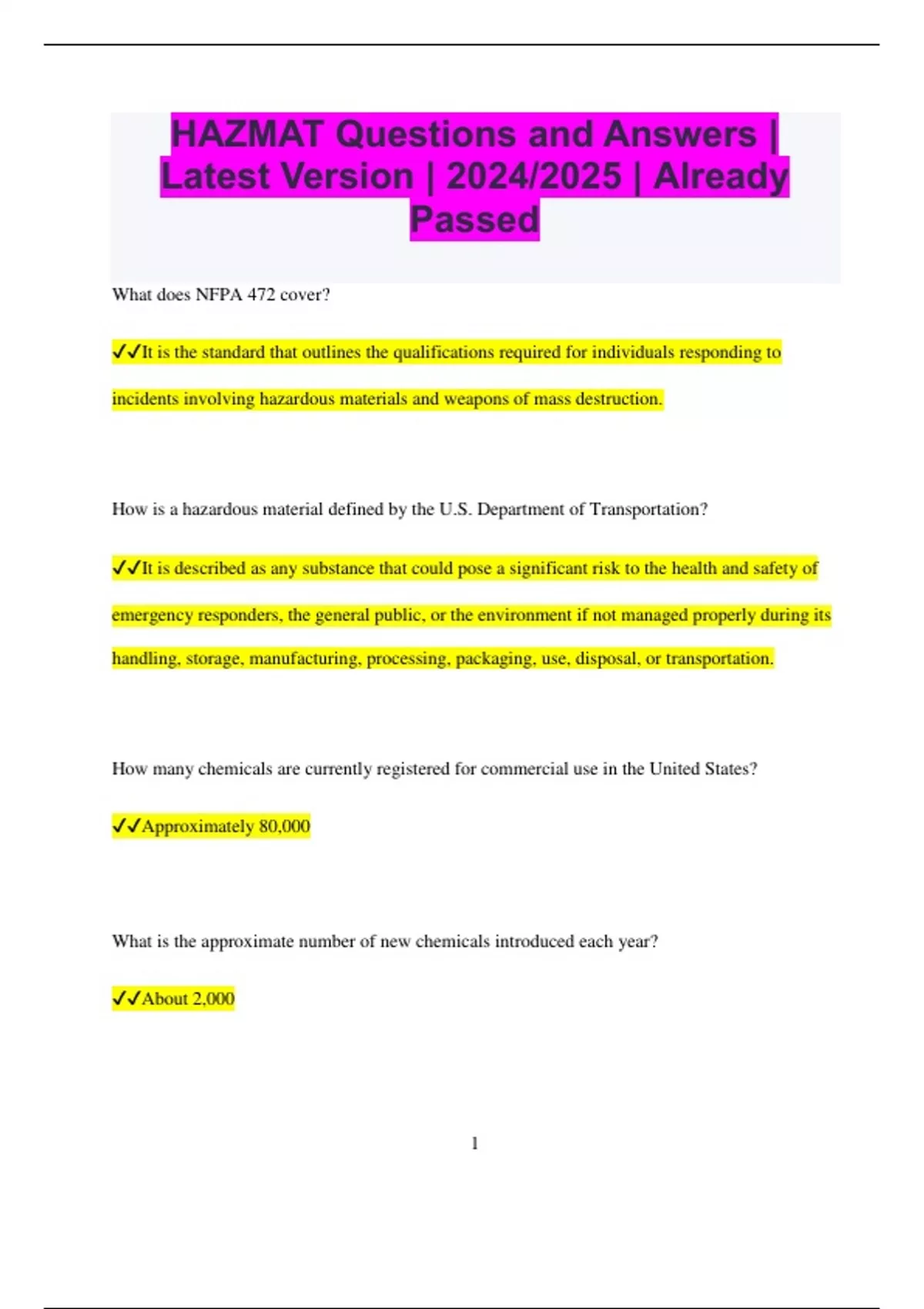 HAZMAT Questions and Answers | Latest Version | 2024/2025 | Already Passed What does NFPA 472 cover? It is the standard that outlines the qualifications required for individuals responding to incidents involving hazardous materials and weapons of mass destruction. How is a hazardous material defined by the U.S. Department of Transportation? It is described as any substance that could pose a significant risk to the health and safety of emergency responders, the general public, or the environment if not managed properly during its handling, storage, manufacturing, processing, packaging, use, disposal, or transportation. How many chemicals are currently registered for commercial use in the United States? Approximately 80,000 What is the approximate number of new chemicals introduced each year? About 2,000 2 What types of substances make up the majority of newly introduced chemicals? Most are industrial chemicals, household cleaning agents, and products for lawn care. What is meant by hazardous waste? It refers to byproducts or residues from manufacturing processes that may be harmful. Such waste can be as dangerous as the original chemicals. Why is hazardous waste particularly challenging to manage? Because it can be a mixture of various chemicals, forming complex substances. Predicting how these mixtures will behave when released or when they interact with other chemicals can be difficult. Which agency typically manages the initial response to a hazardous materials incident? The fire department is generally responsible for the first phase of emergency response in such situations. What are regulations? They are rules set and enforced by government agencies like the U.S. Occupational Safety and Health Administration (OSHA) and the U.S. Environmental Protection Agency (EPA). 3 What are standards? Standards are guidelines issued by non-governmental organizations based on consensus. Bodies like the NFPA create these standards, which are open to public input before being finalized by the committees. From which committee do the NFPA standards related to hazardous materials response originate? They are developed by the Technical Committee on HAZMAT Response Personnel, which includes members from various sectors such as private industry, fire services, and governmental agencies. What does NFPA 473 specify? It is the standard for the competencies required for emergency medical services (EMS) personnel responding to incidents involving hazardous materials and weapons of mass destruction. Levels of awareness are listed under what standard? NFPA 472 4 NFPA 1072 HAZMAT/WOFMD emergency response personnel professional qualifications HAZWOPER