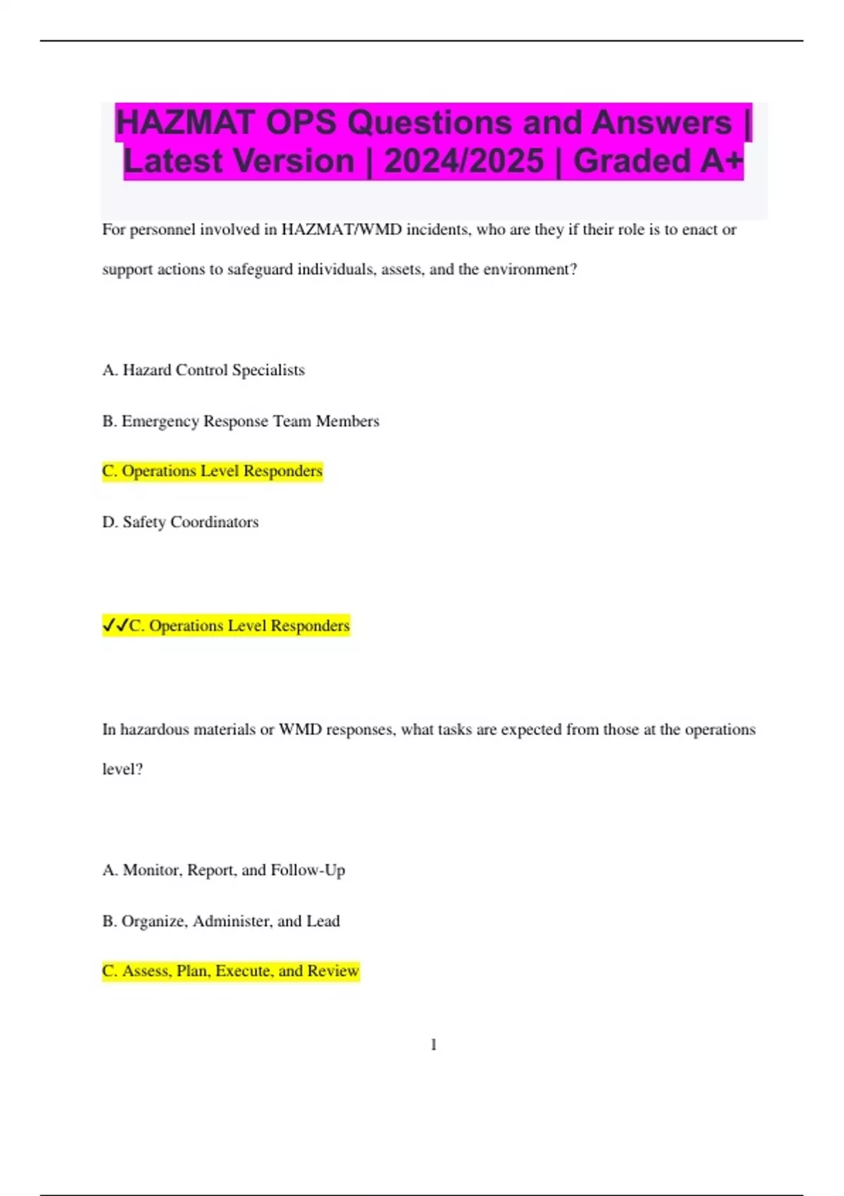 HAZMAT OPS Questions and Answers | Latest Version | 2024/2025 | Graded A+ For personnel involved in HAZMAT/WMD incidents, who are they if their role is to enact or support actions to safeguard individuals, assets, and the environment? A. Hazard Control Specialists B. Emergency Response Team Members C. Operations Level Responders D. Safety Coordinators C. Operations Level Responders In hazardous materials or WMD responses, what tasks are expected from those at the operations level? A. Monitor, Report, and Follow-Up B. Organize, Administer, and Lead C. Assess, Plan, Execute, and Review 2 D. Coordinate, Communicate, and Evaluate C. Assess, Plan, Execute, and Review What is the primary responsibility of an Operations Level Responder? A. Safeguard the safety of individuals B. Contain hazardous substances C. Manage financial resources D. Ensure environmental protection A. Safeguard the safety of individuals What term describes the chemical characteristics of a substance, including how it reacts at a molecular level? A. Physical Traits B. Chemical Characteristics 3 C. Molecular Behavior D. Chemical Properties D. Chemical Properties